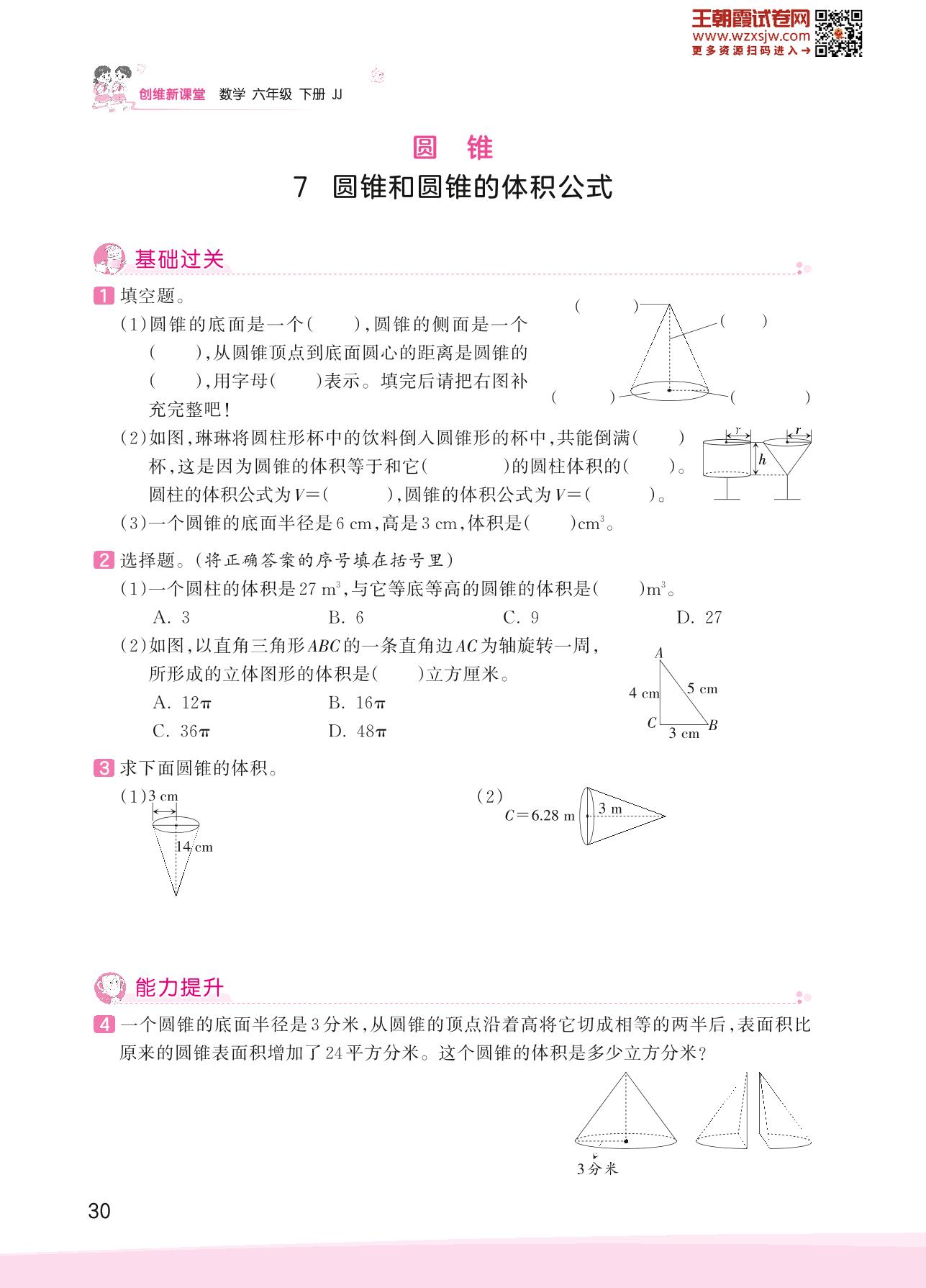 2023下册六年级数学冀教版 四 圆柱和圆锥——7 圆锥和圆锥的体积公式