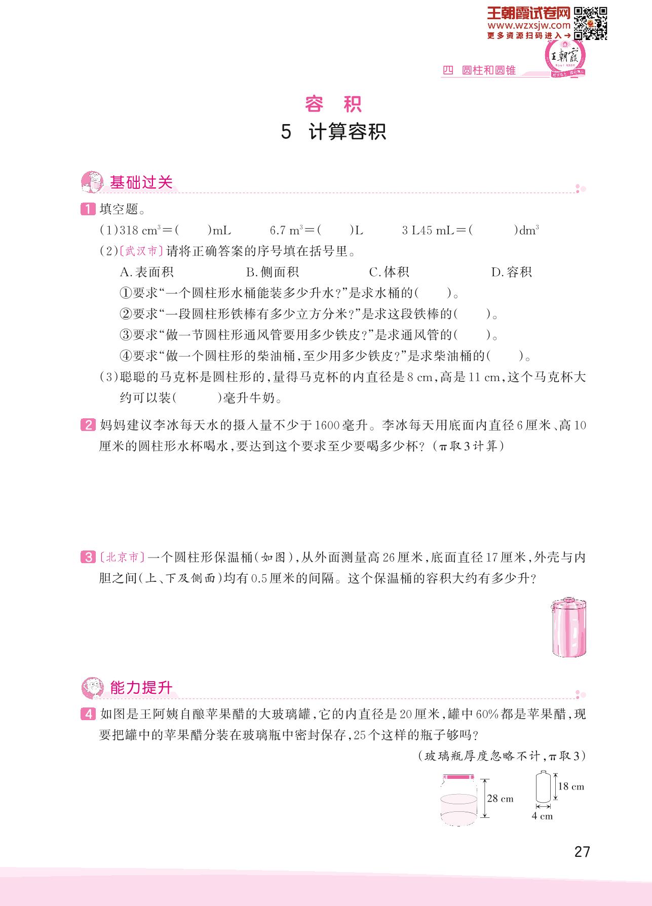 2023下册六年级数学冀教版 四 圆柱和圆锥——5 计算容积