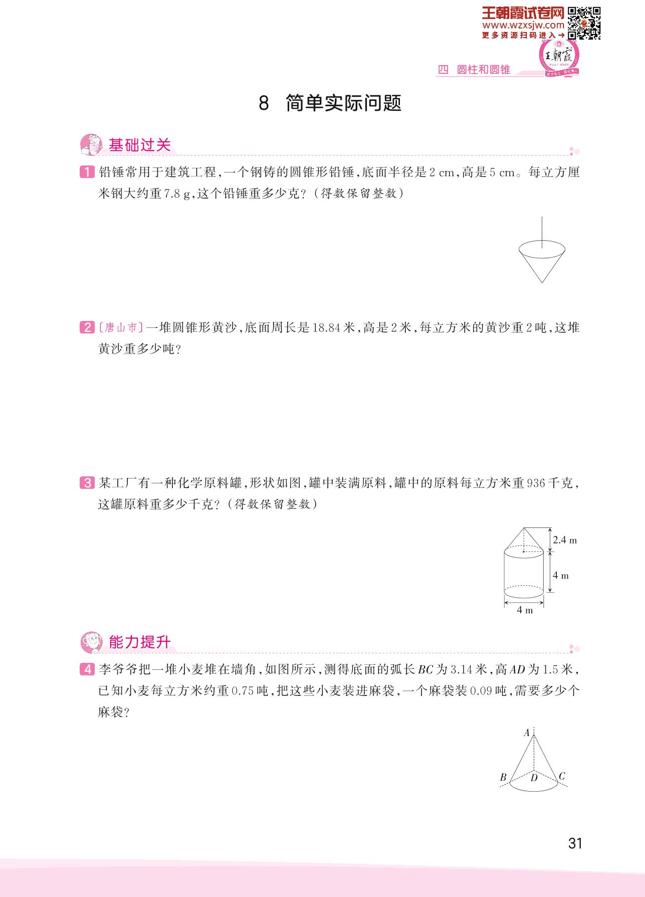 2023下册六年级数学冀教版 四 圆柱和圆锥——8 简单实际问题