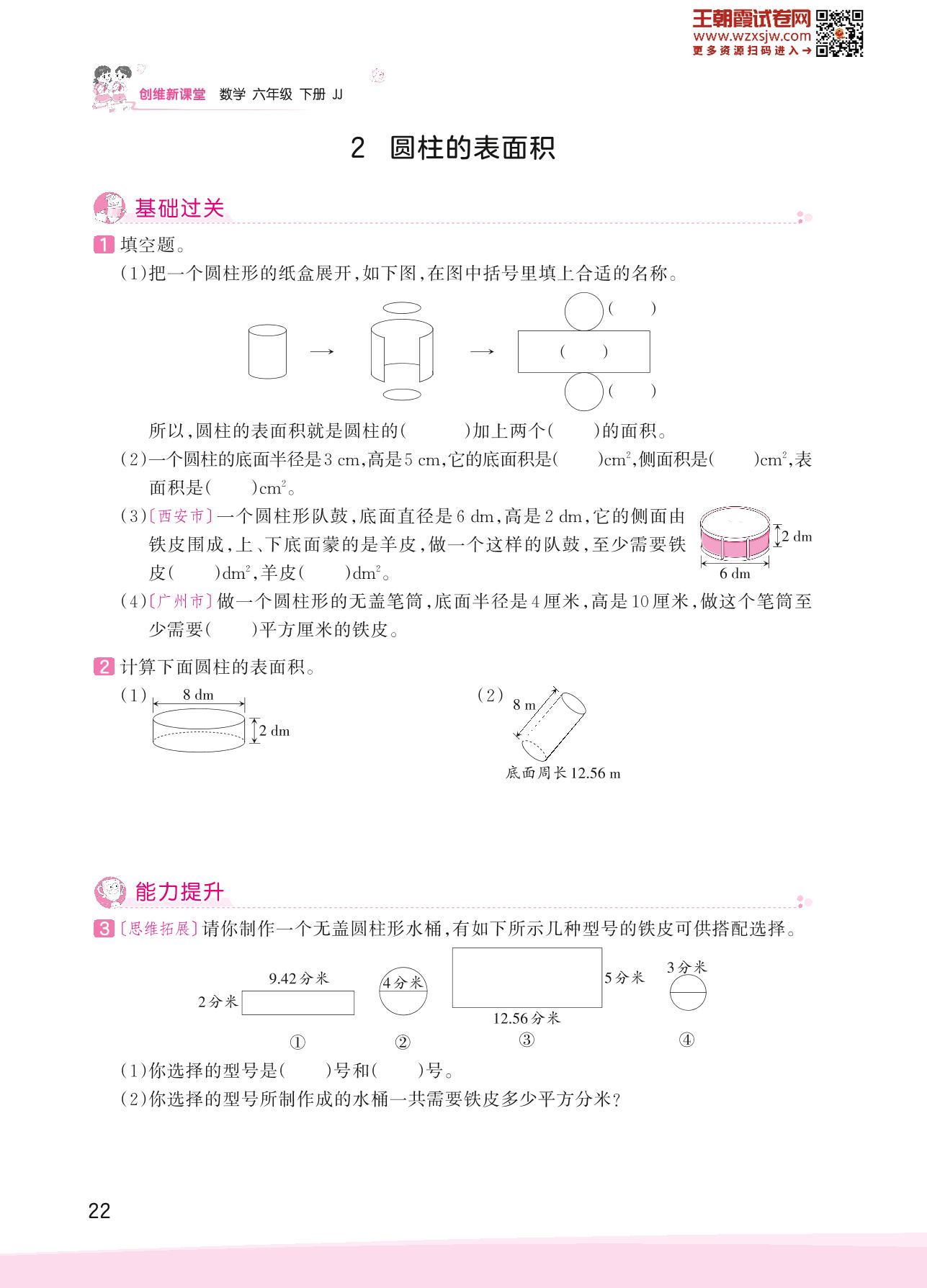 2023下册六年级数学冀教版 四 圆柱和圆锥——2 圆柱的表面积