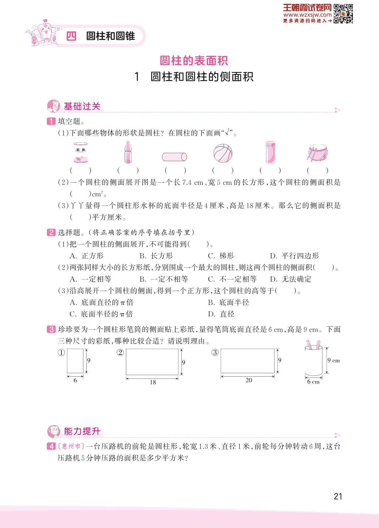 2023下册六年级数学冀教版 四 圆柱和圆锥——1 圆柱和圆柱的侧面积
