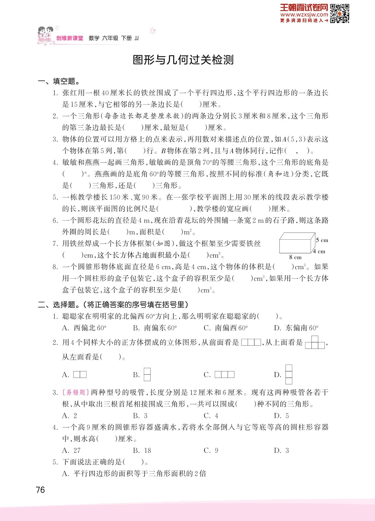 2023下册六年级数学冀教版 六 回顾与整理——图形与几何过关检测