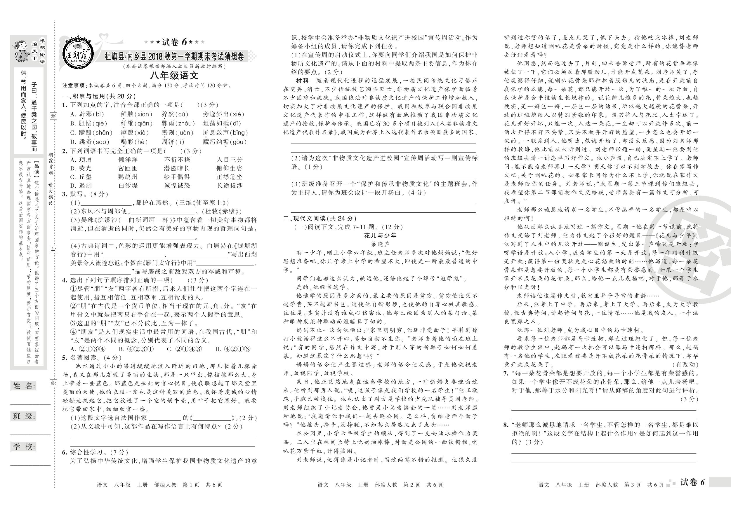 2017-2018学年第一学期南阳市社旗县、内乡县猜想卷八年级语文试卷(人教版)【6】