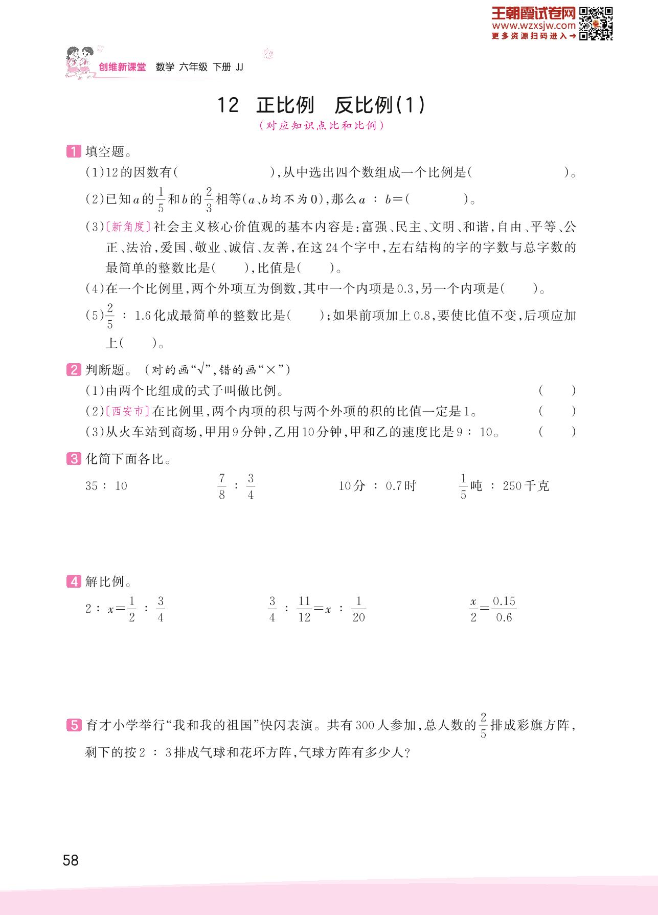 2023下册六年级数学冀教版 六 回顾与整理——12 正比例 反比例(1)