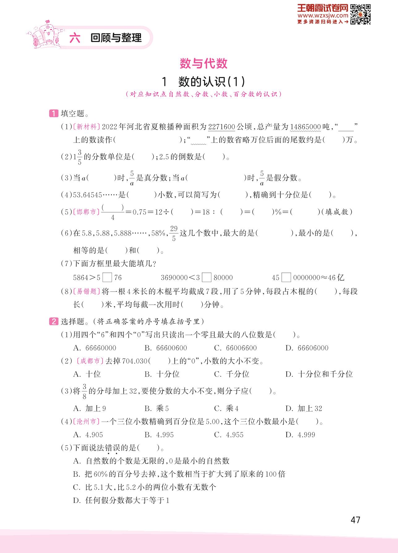 2023下册六年级数学冀教版 六 回顾与整理——1 数的认识(1)