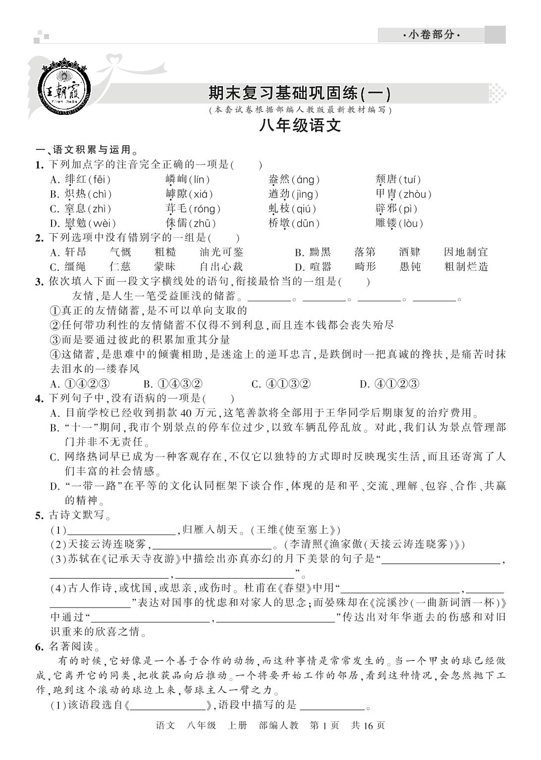 王朝霞期末小卷——期末复习基础巩固练八年级上册语文(人教版)_R210802182608【0】