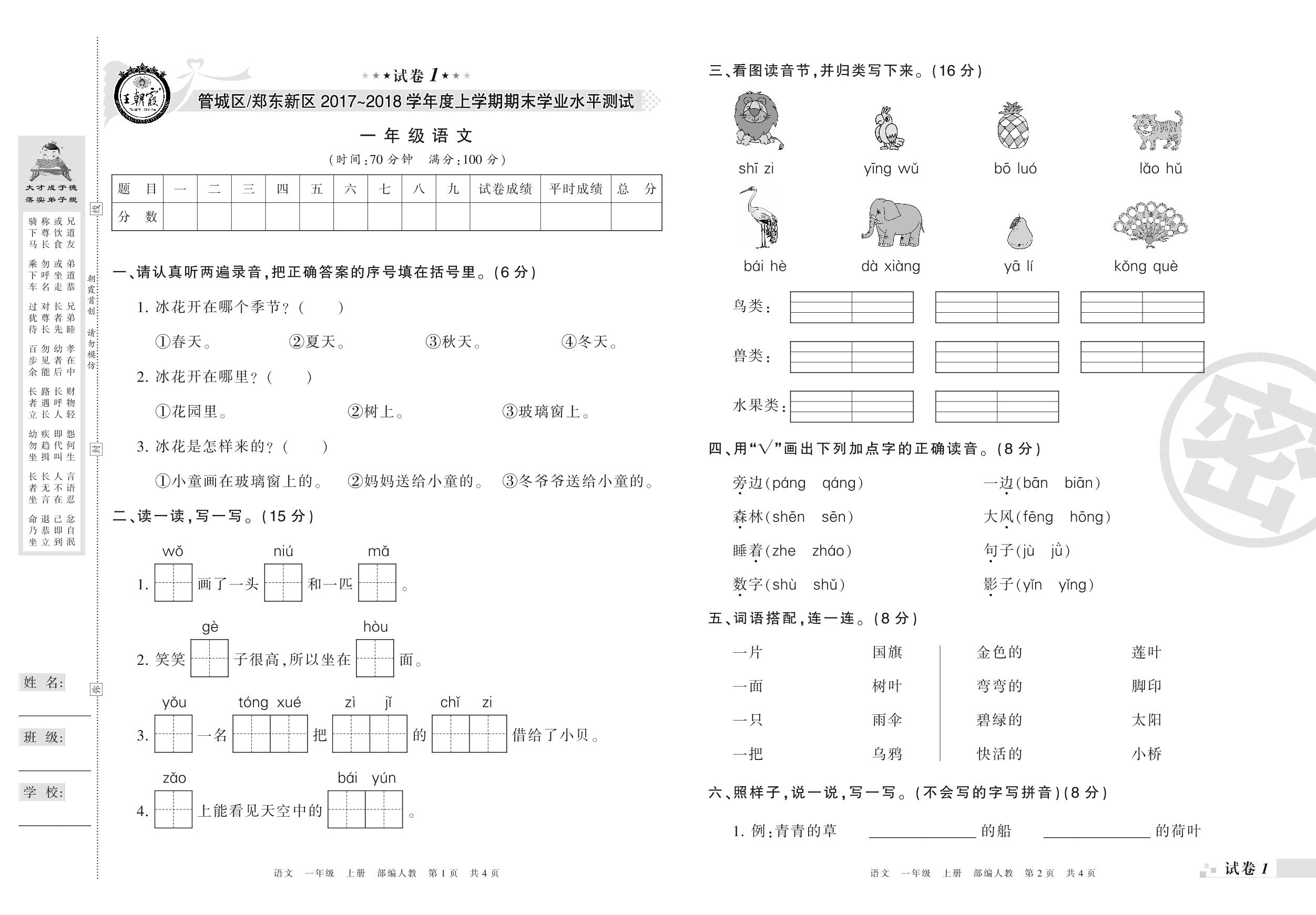 2017-2018学年第一学期郑州市管城区(郑东新区)一年级语文试卷(人教版)【1】
