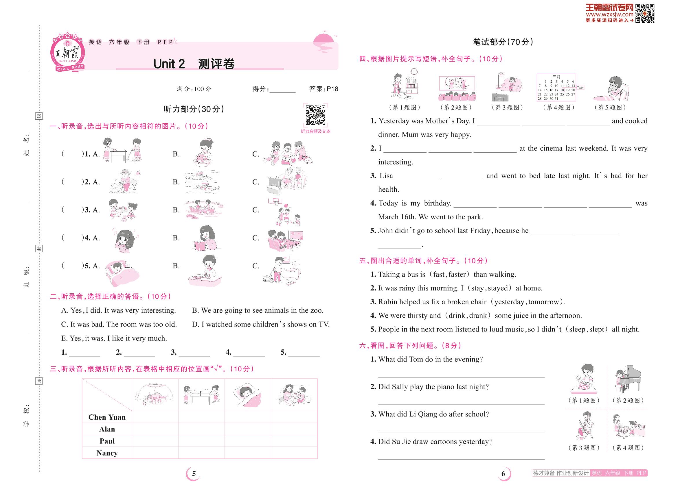 2023下册六年级英语人教PEP版 Unit 2 测评卷