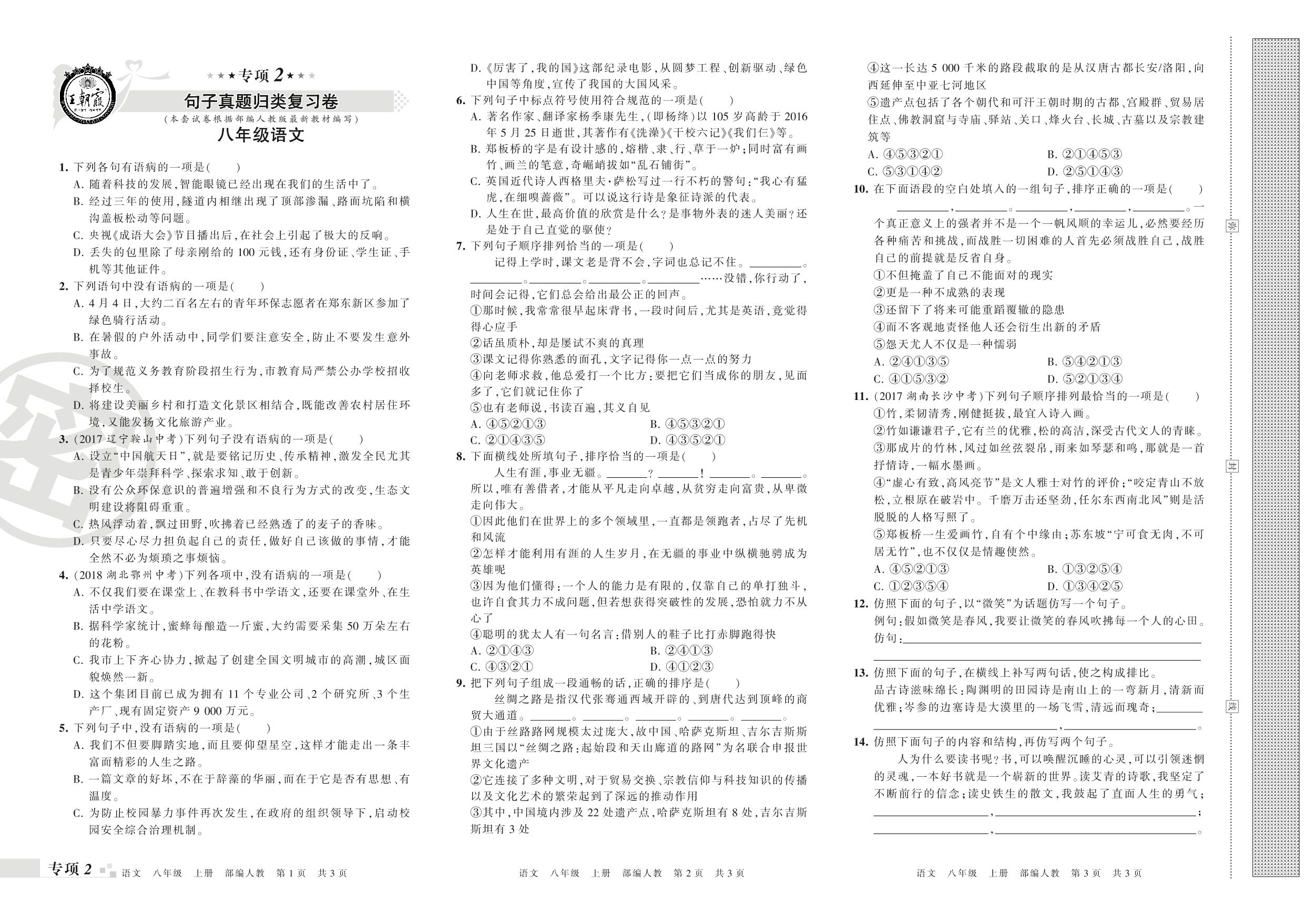 王朝霞期末专项卷——句子真题归类复习卷八年级上册语文(人教版)_R210802182620【0】