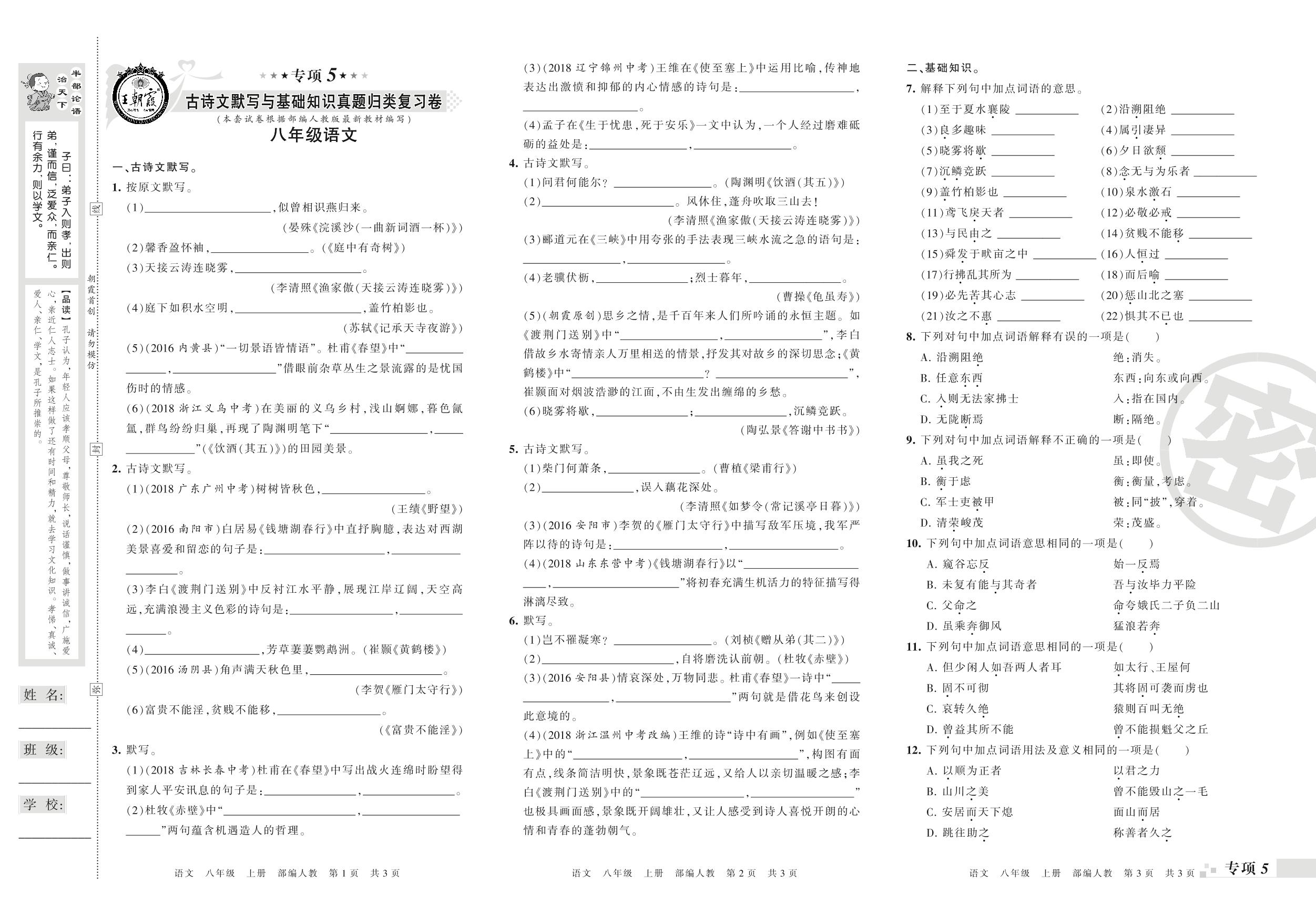 王朝霞期末专项卷——古诗文默写与基础知识真题归类复习卷八年级上册语文(人教版)_R210802182637【0】