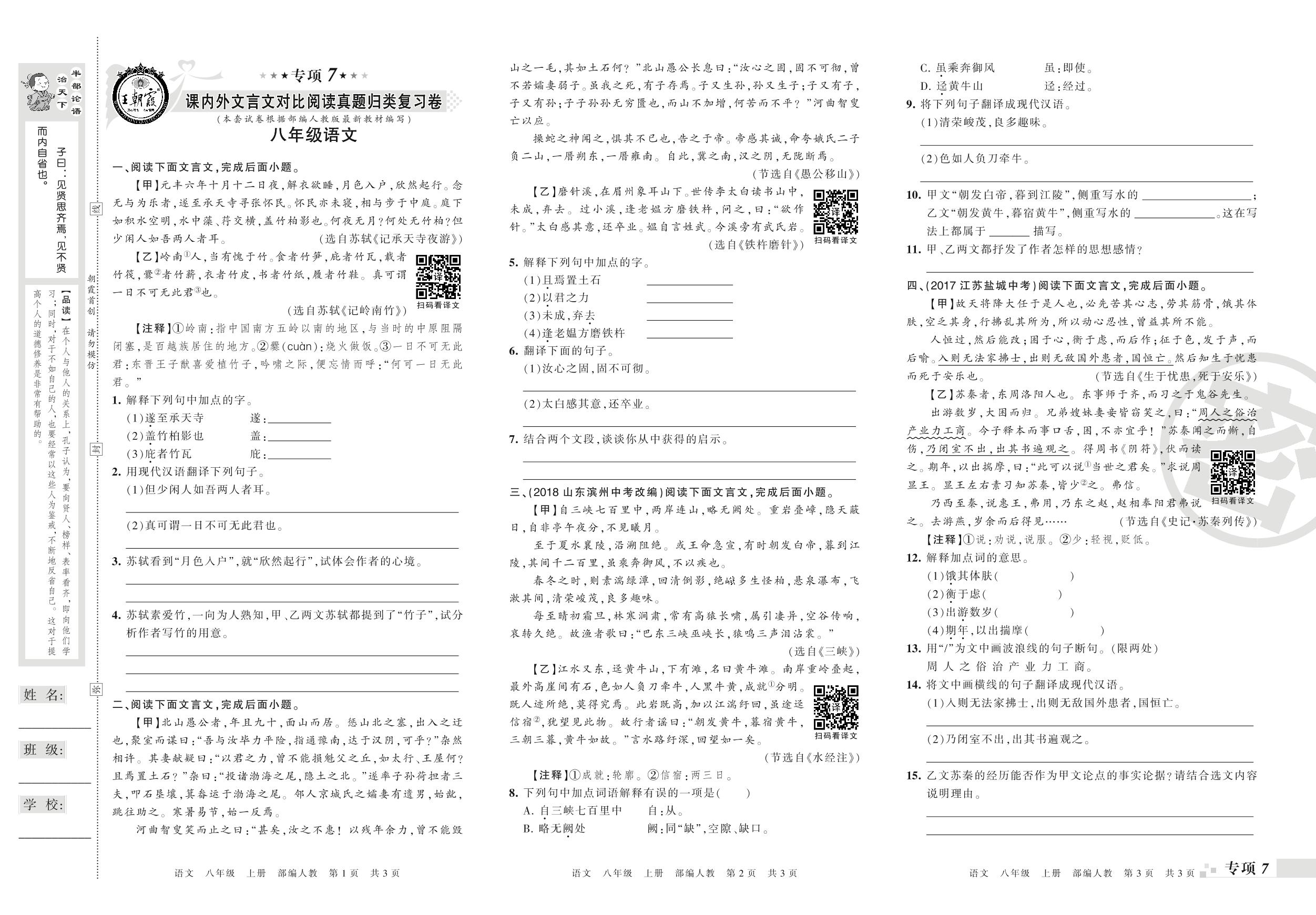 王朝霞期末专项卷——课内外文言文对比阅读真题归类复习卷八年级上册语文(人教版)_R210802182644【0】