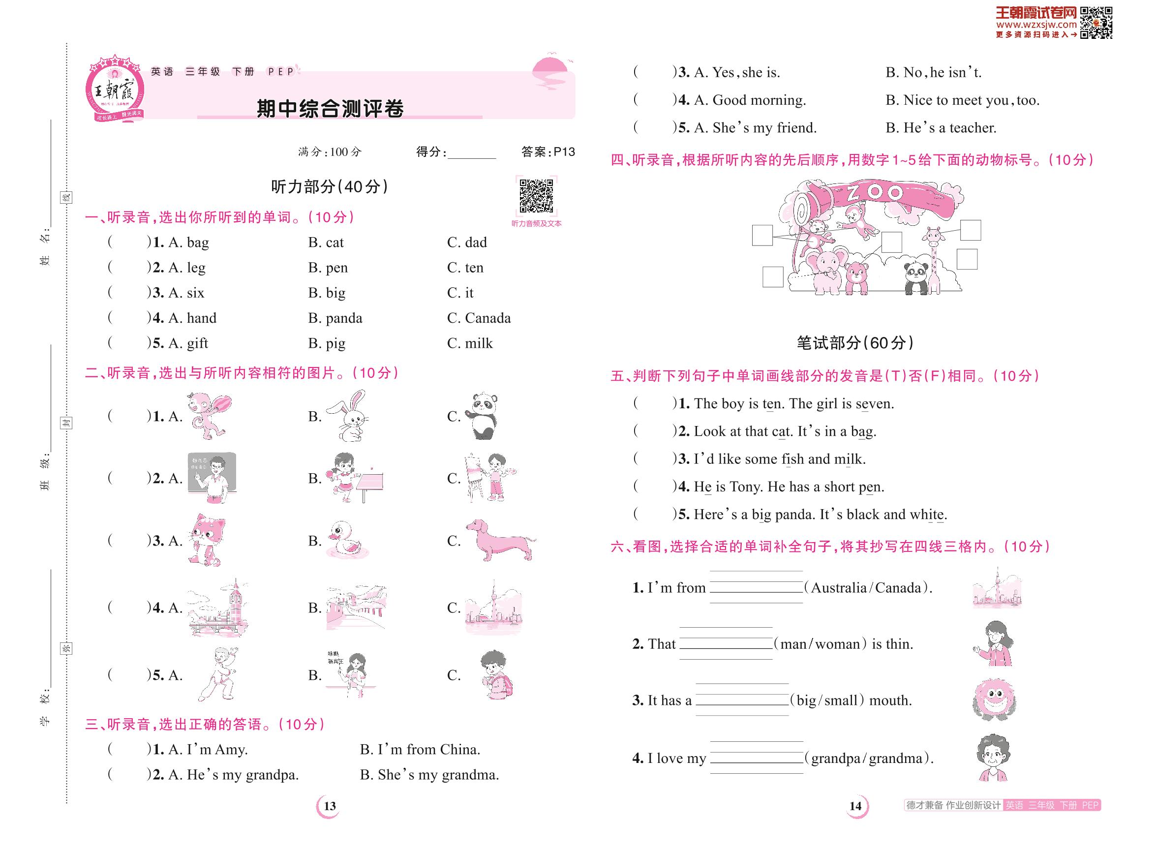 2023下册三年级英语人教PEP版 期中综合测评卷
