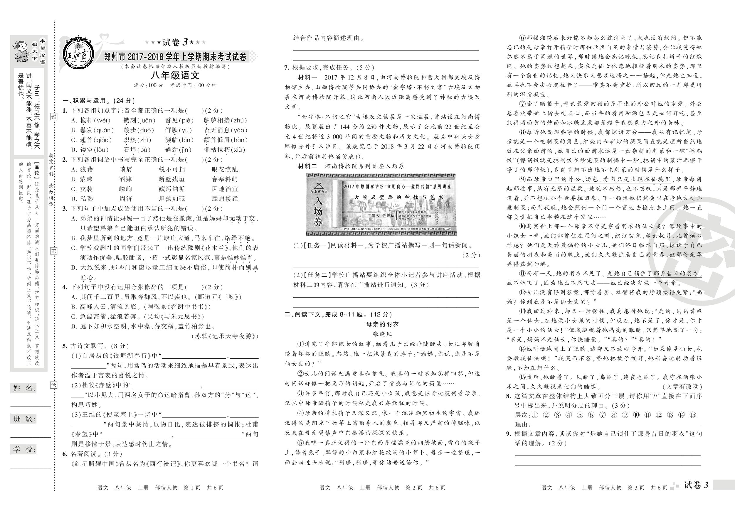 2017-2018学年第一学期郑州市猜想卷八年级语文试卷(人教版)【3】