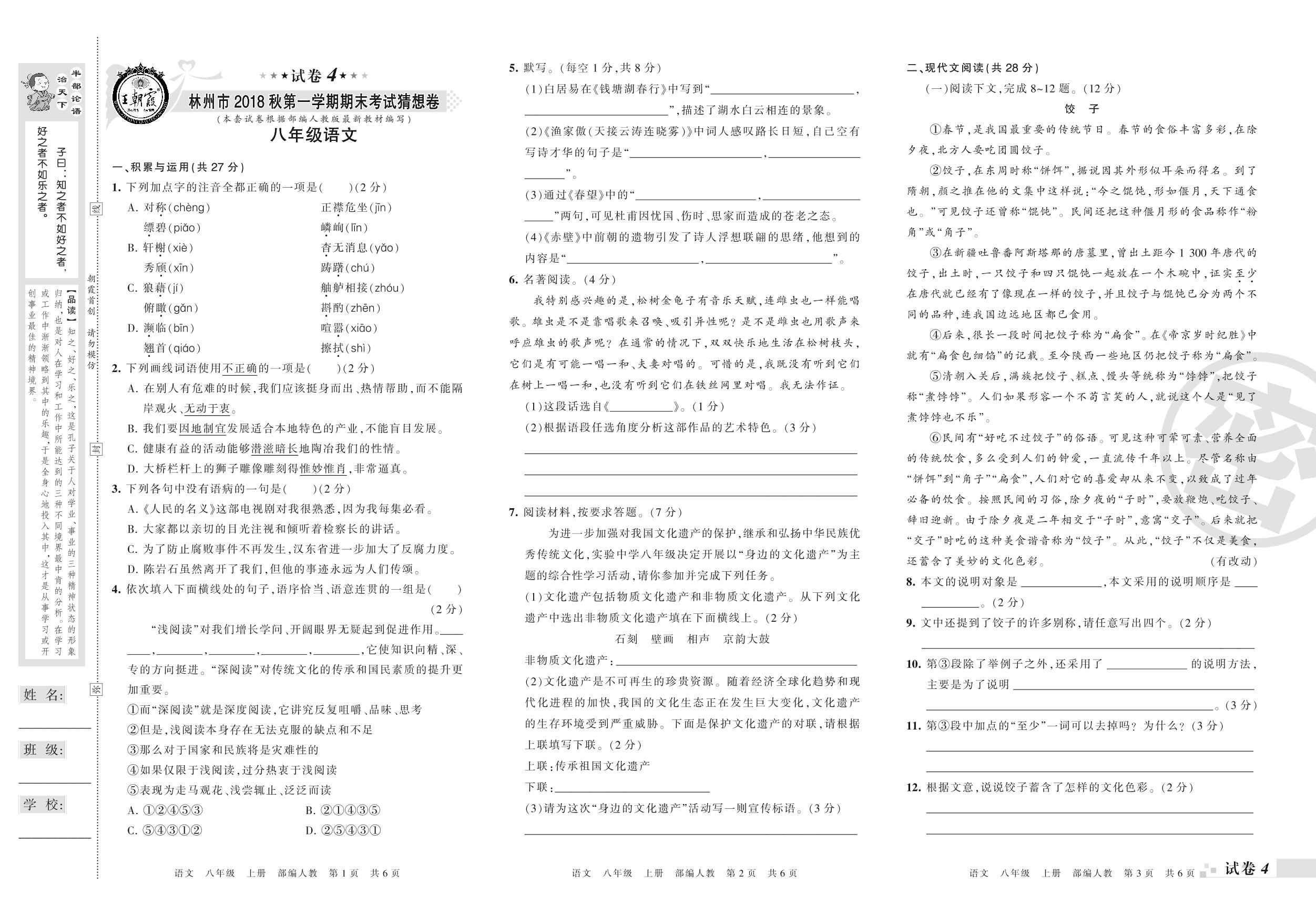 2017-2018学年第一学期林州市猜想卷八年级语文试卷(人教版)【4】