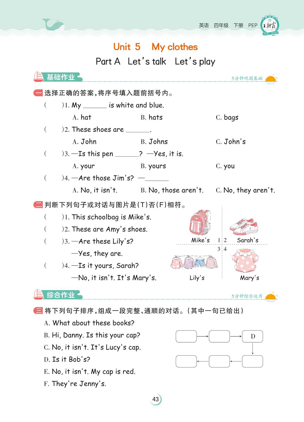 四年级英语人教PEP版(三起始)下册课时作业