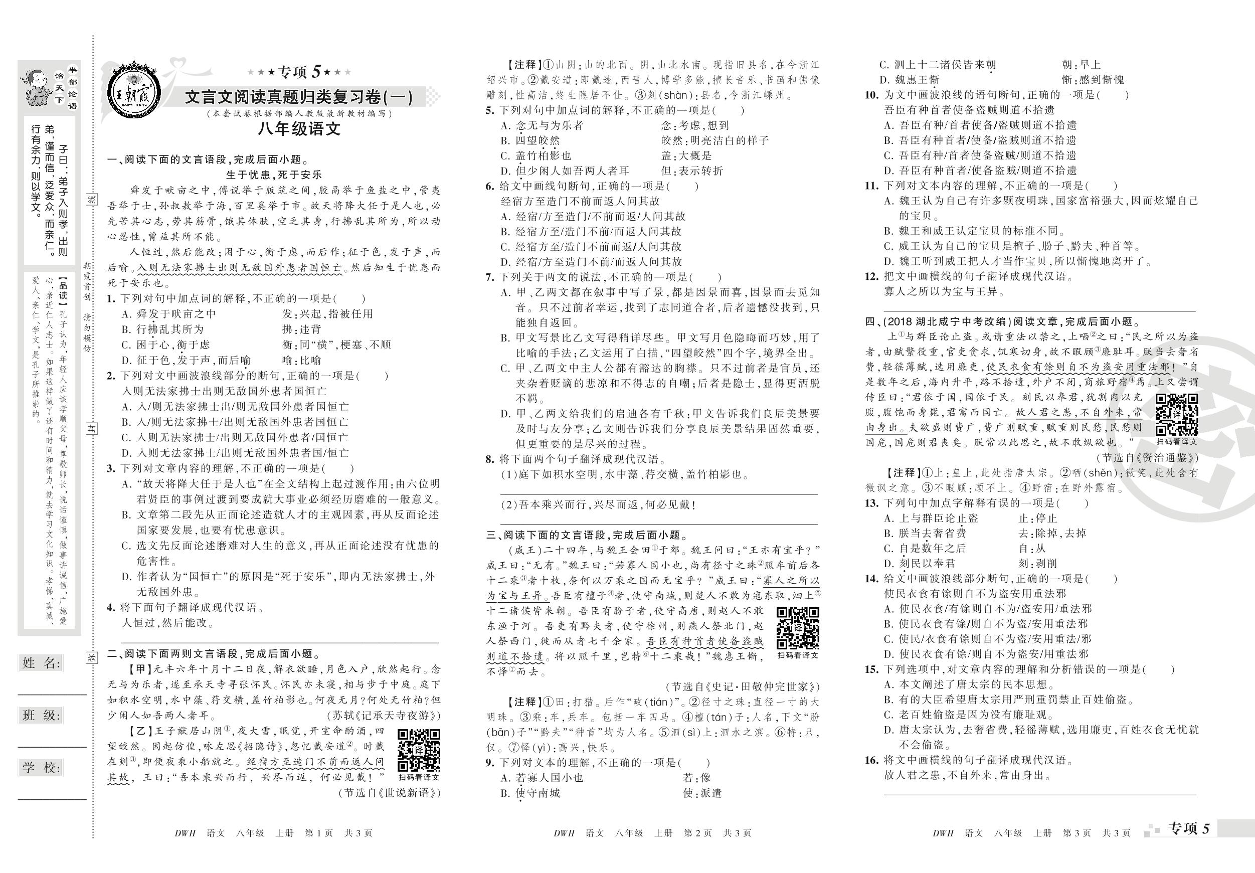 王朝霞期末专项卷——文言文阅读(一)(二)真题归类复习卷八年级上册语文(人教版)_R210802182835【0】