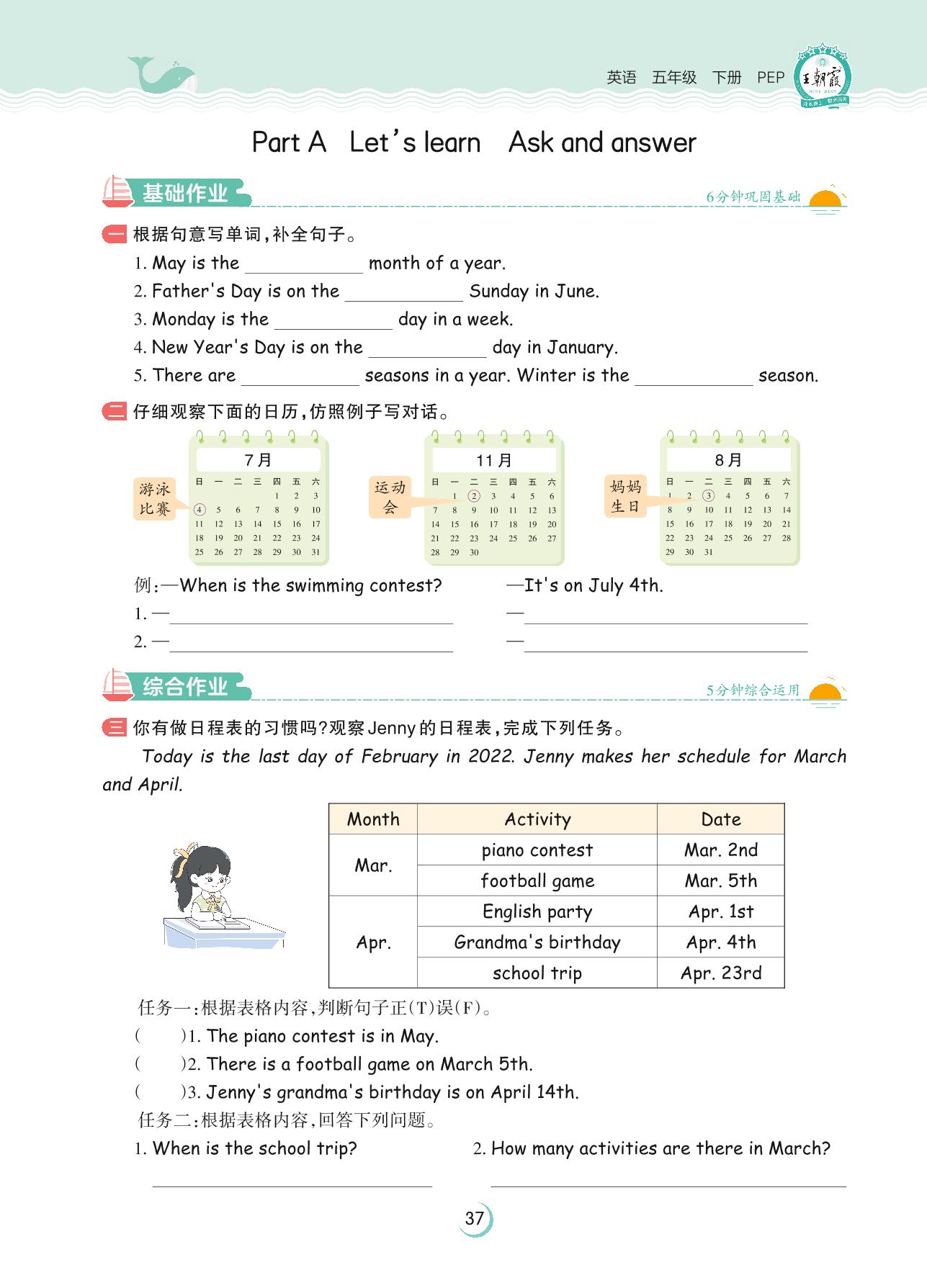 2023下册五年级英语人教PEP版 Unit 4 Part A—Let’s learn Ask and answer