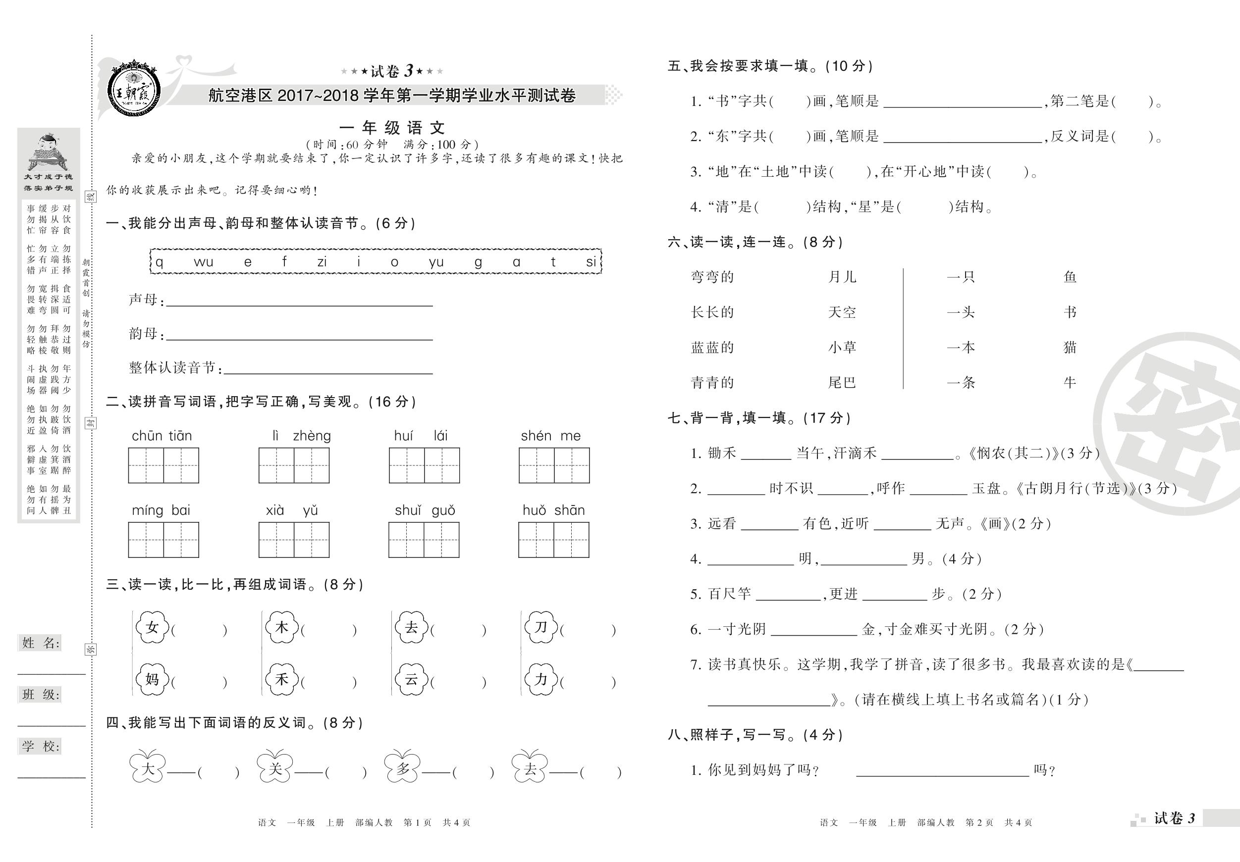 2017-2018学年第一学期郑州市航空城区一年级语文试卷(人教版)【3】