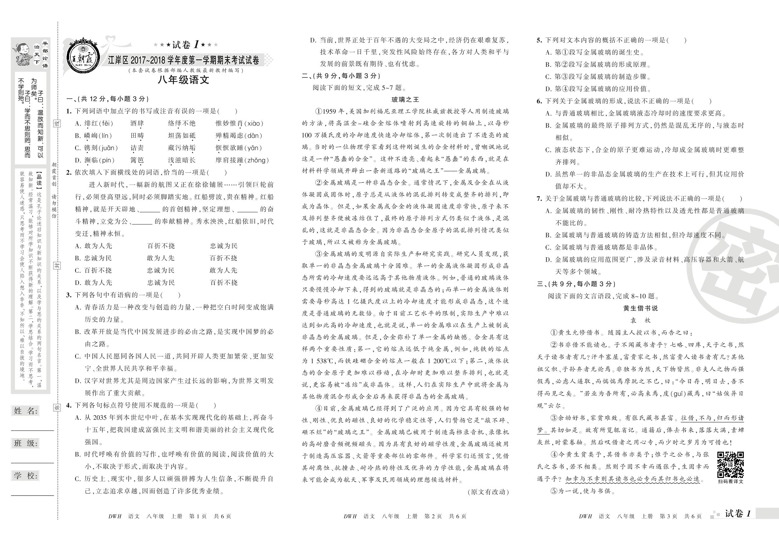 2017-2018学年第一学期武汉市江岸区八年级语文试卷(人教版)【1】