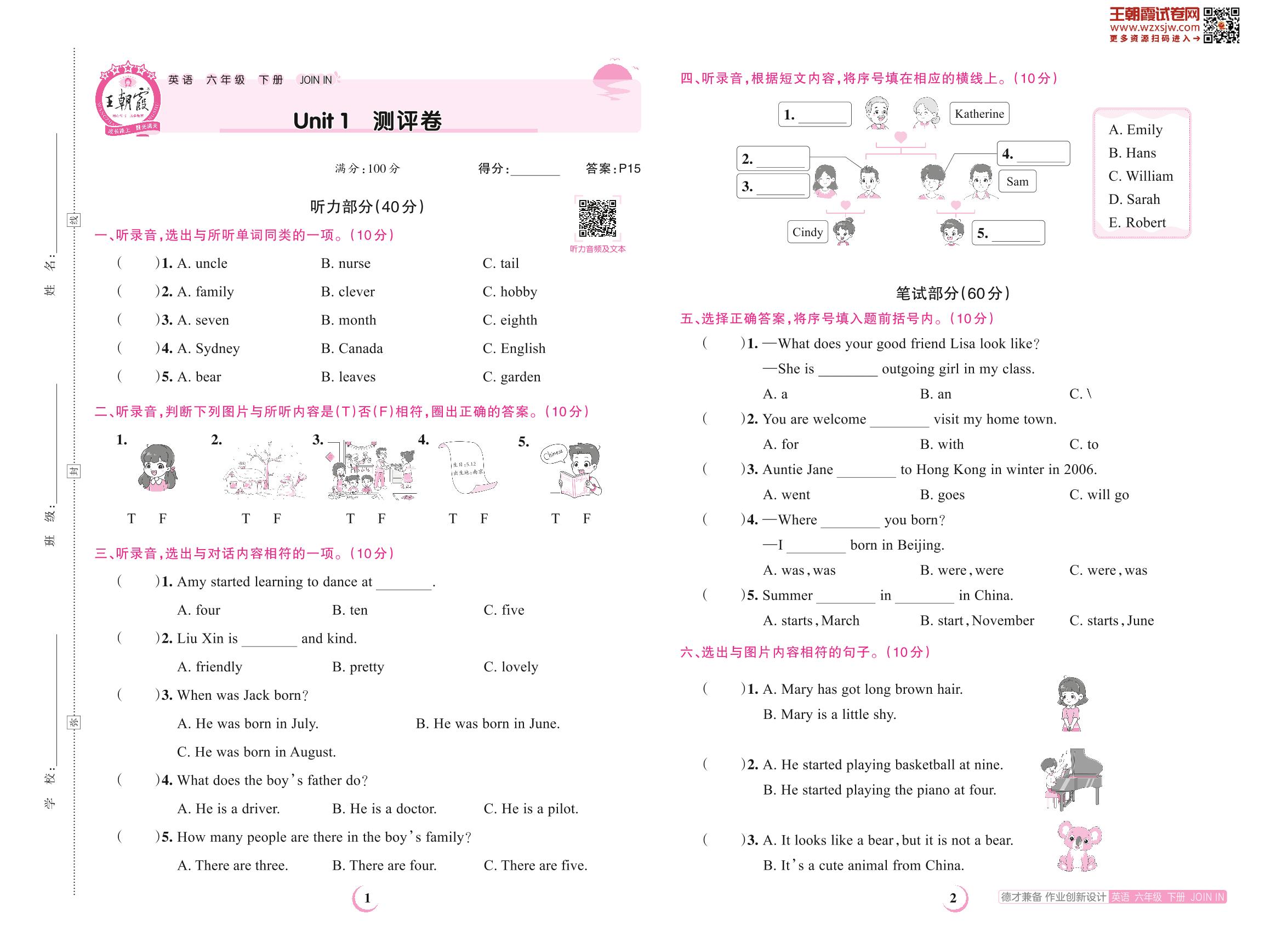 2023下册六年级英语剑桥版 Unit 1 测评卷