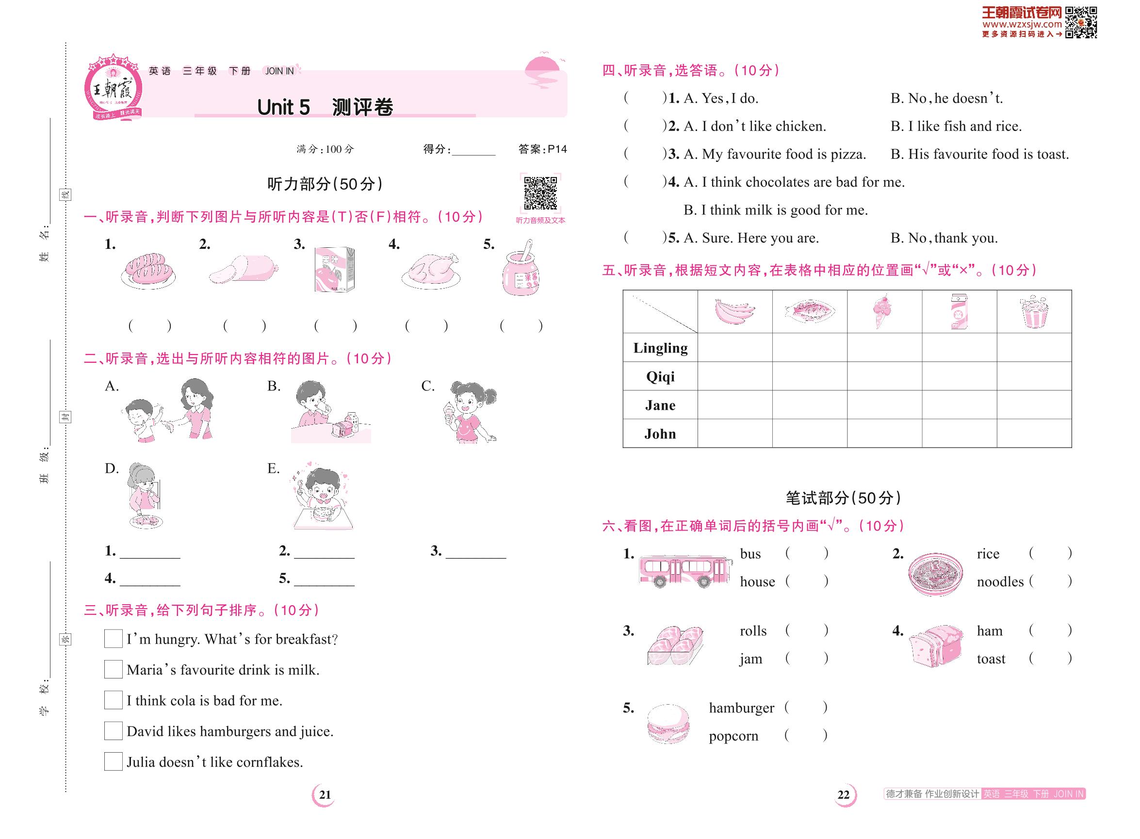 2023下册三年级英语剑桥版 Unit 5 测评卷