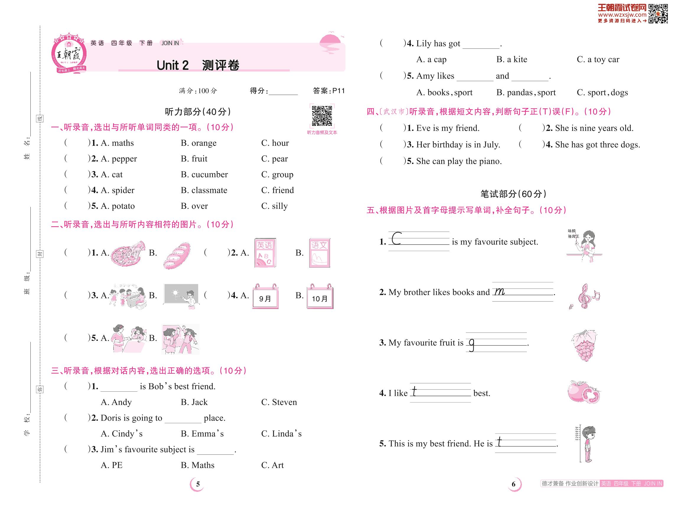 2023下册四年级英语剑桥版 Unit 2 测评卷