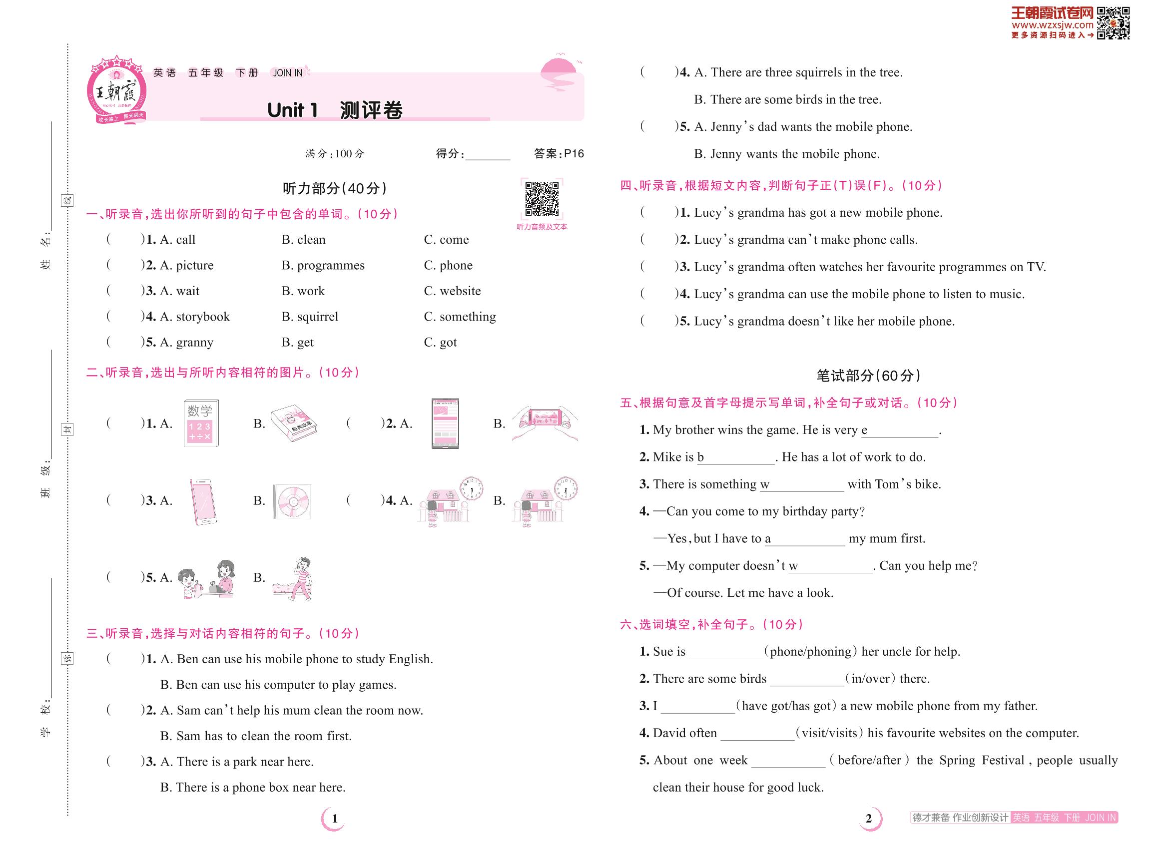五年级英语剑桥版下册单元卷