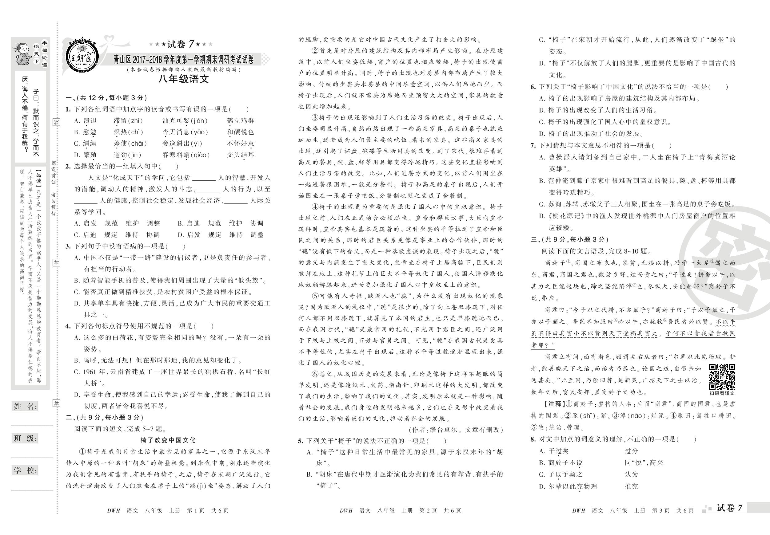 2017-2018学年第一学期武汉市青山区八年级语文试卷(人教版)【7】