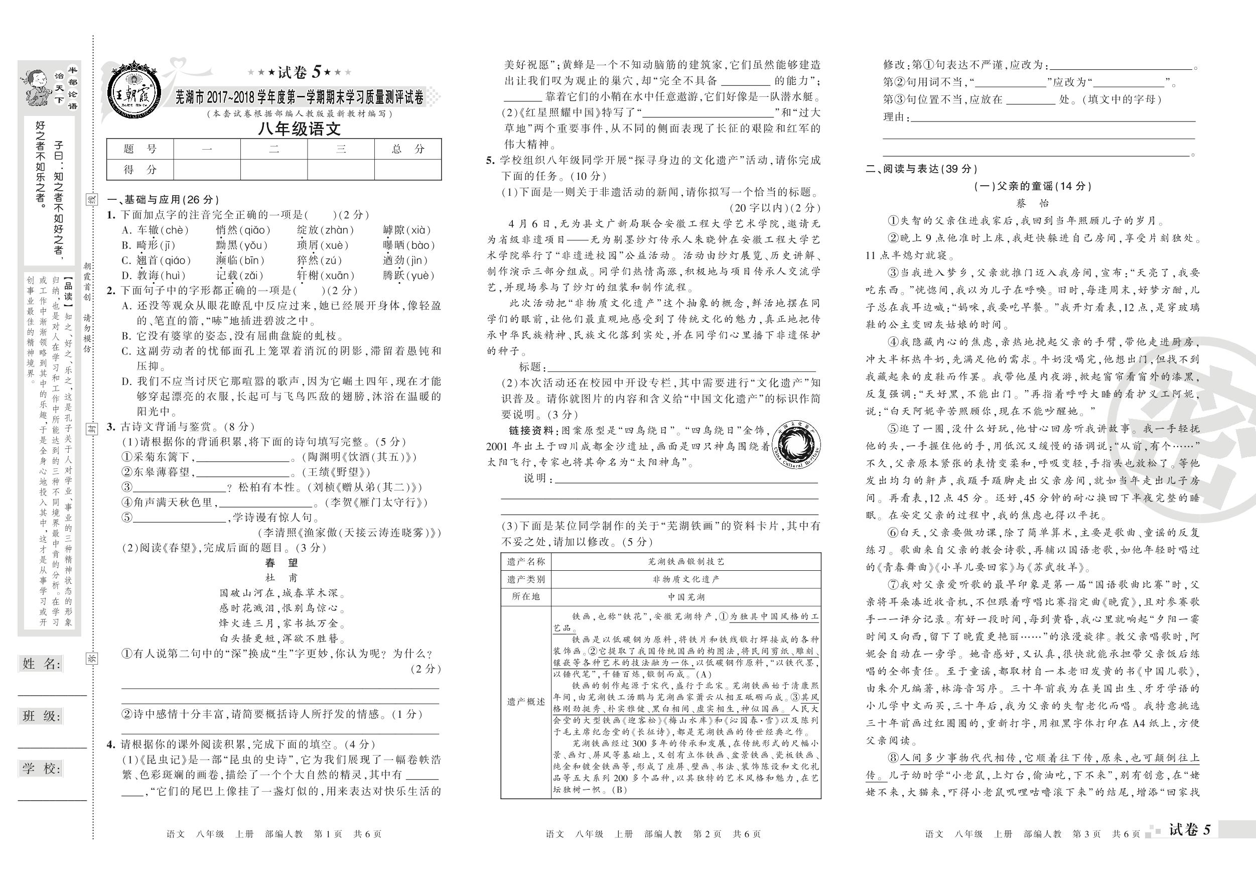 2017-2018学年第一学期芜湖市八年级语文试卷(人教版)【5】