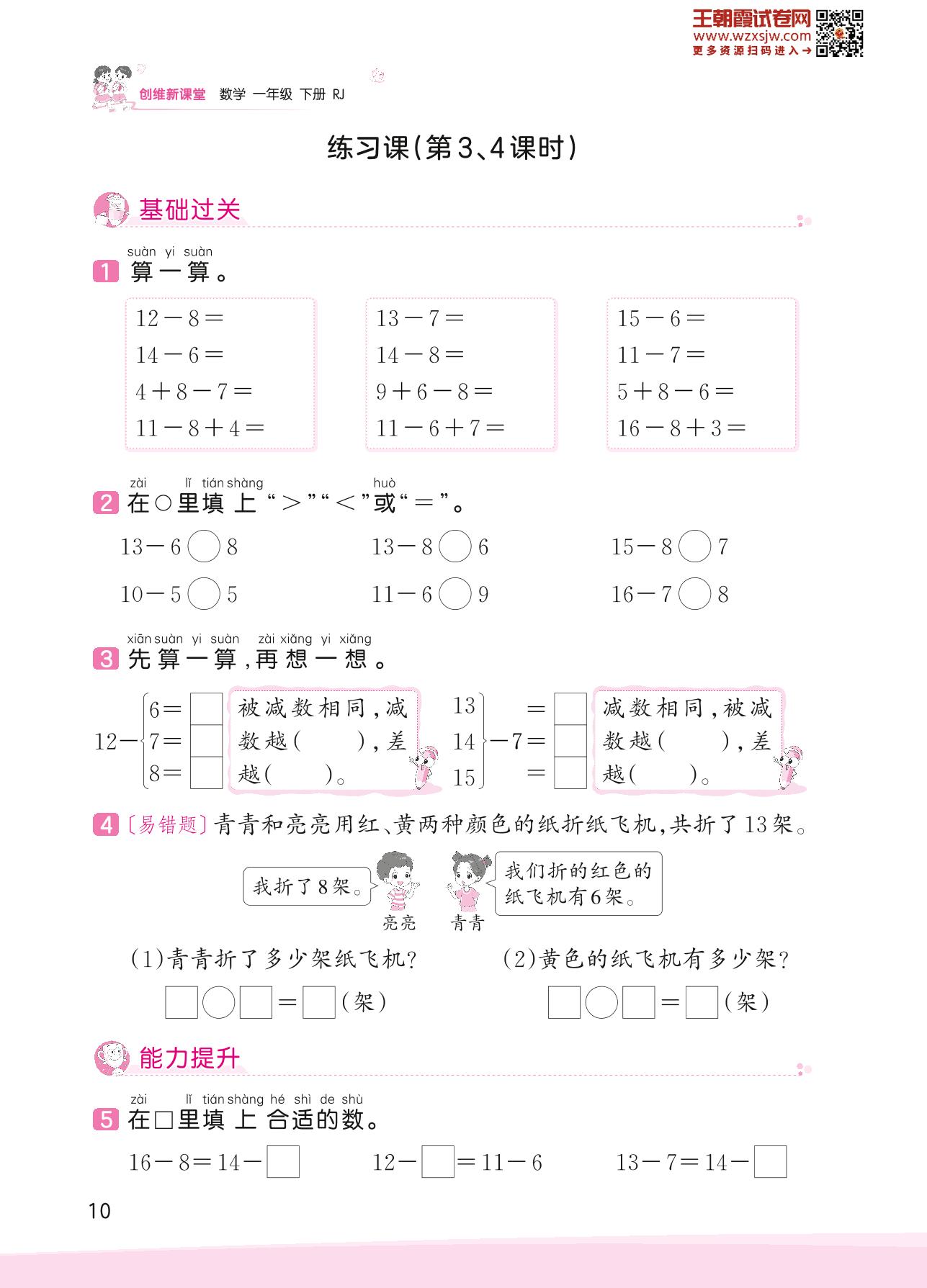 2023下册一年级数学人教版 二 20以内的退位减法——练习课(第3、4课时)