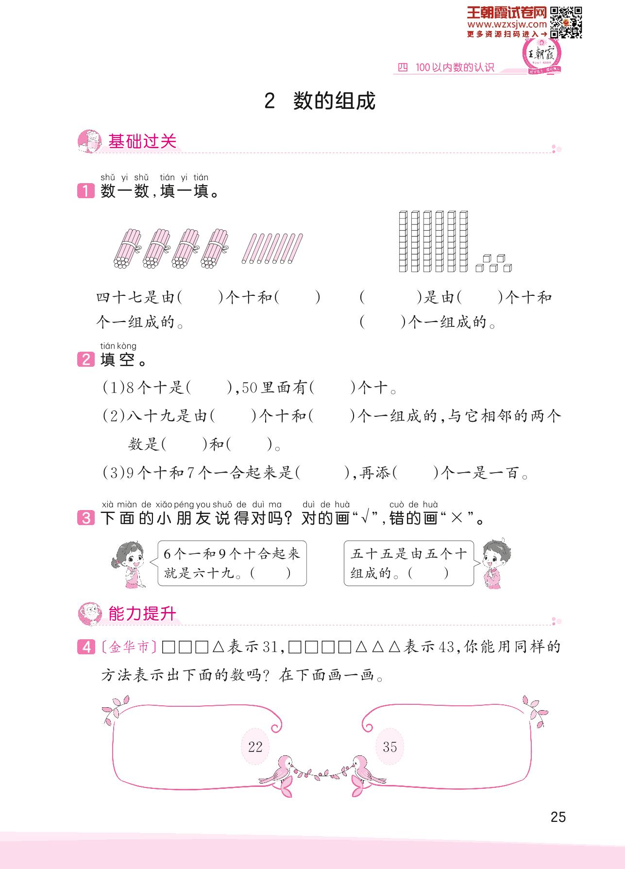 2023下册一年级数学人教版 四 100以内数的认识——2 数的组成
