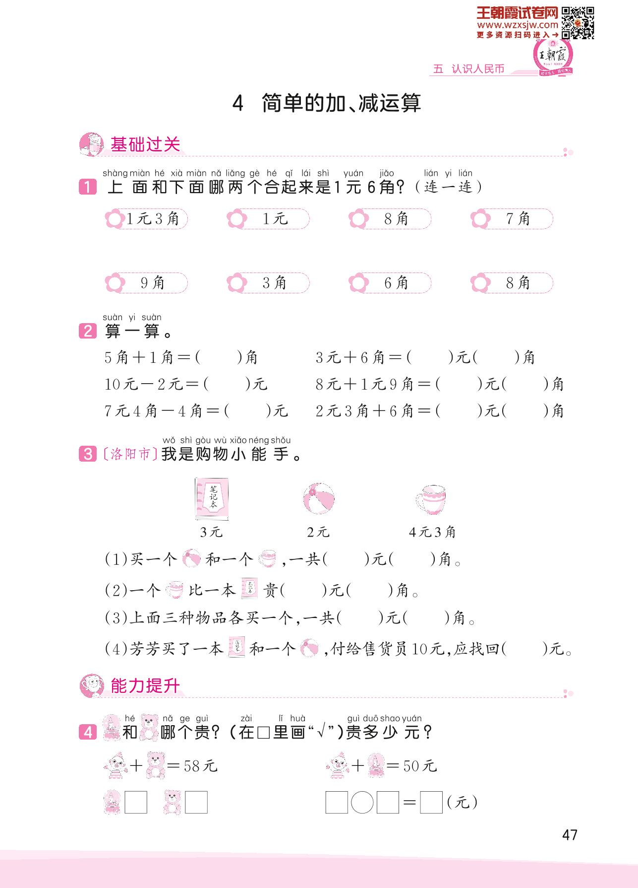 2023下册一年级数学人教版 五 认识人民币——4 简单的加、减运算