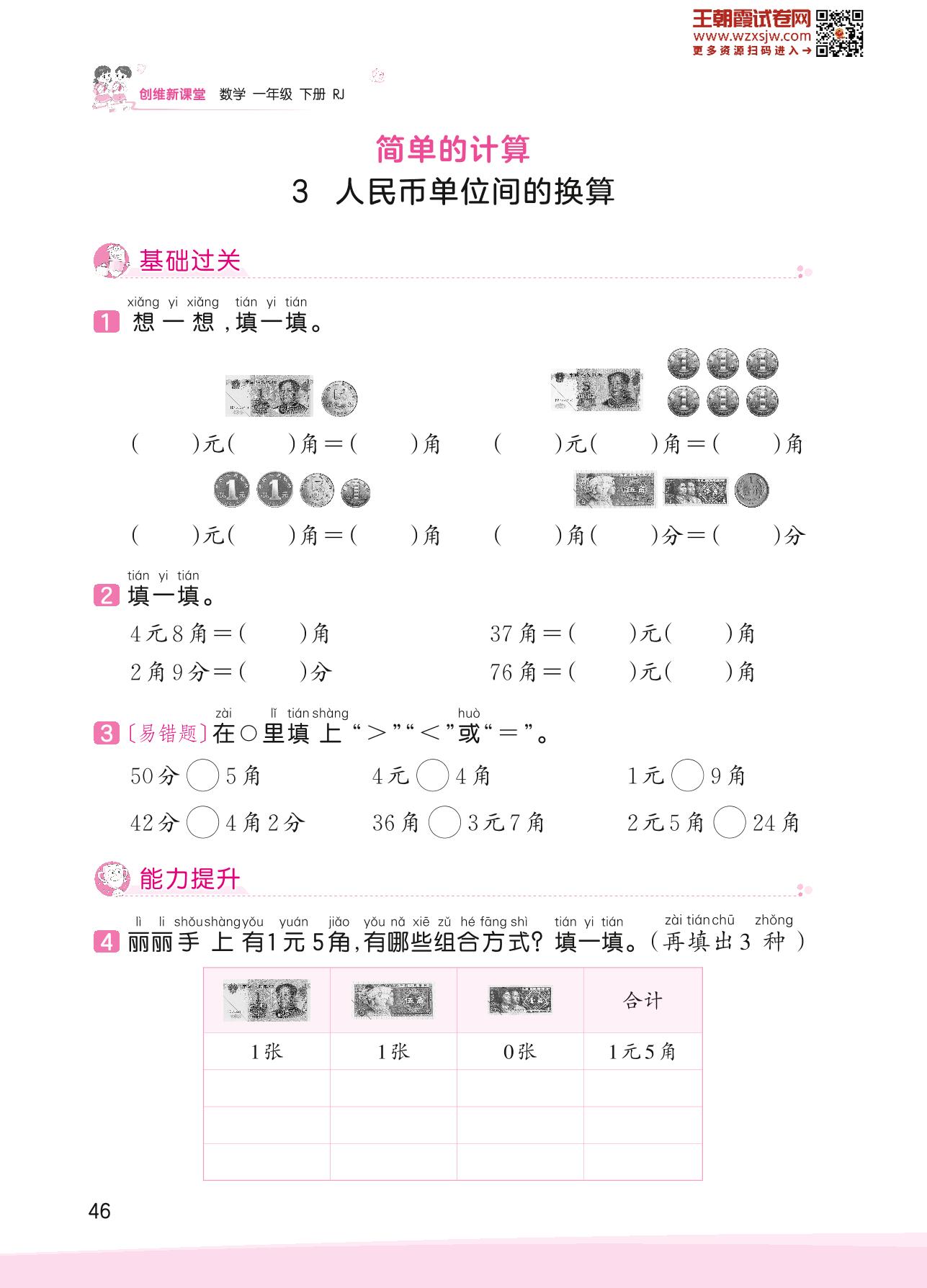 2023下册一年级数学人教版 五 认识人民币——3 人民币单位间的换算