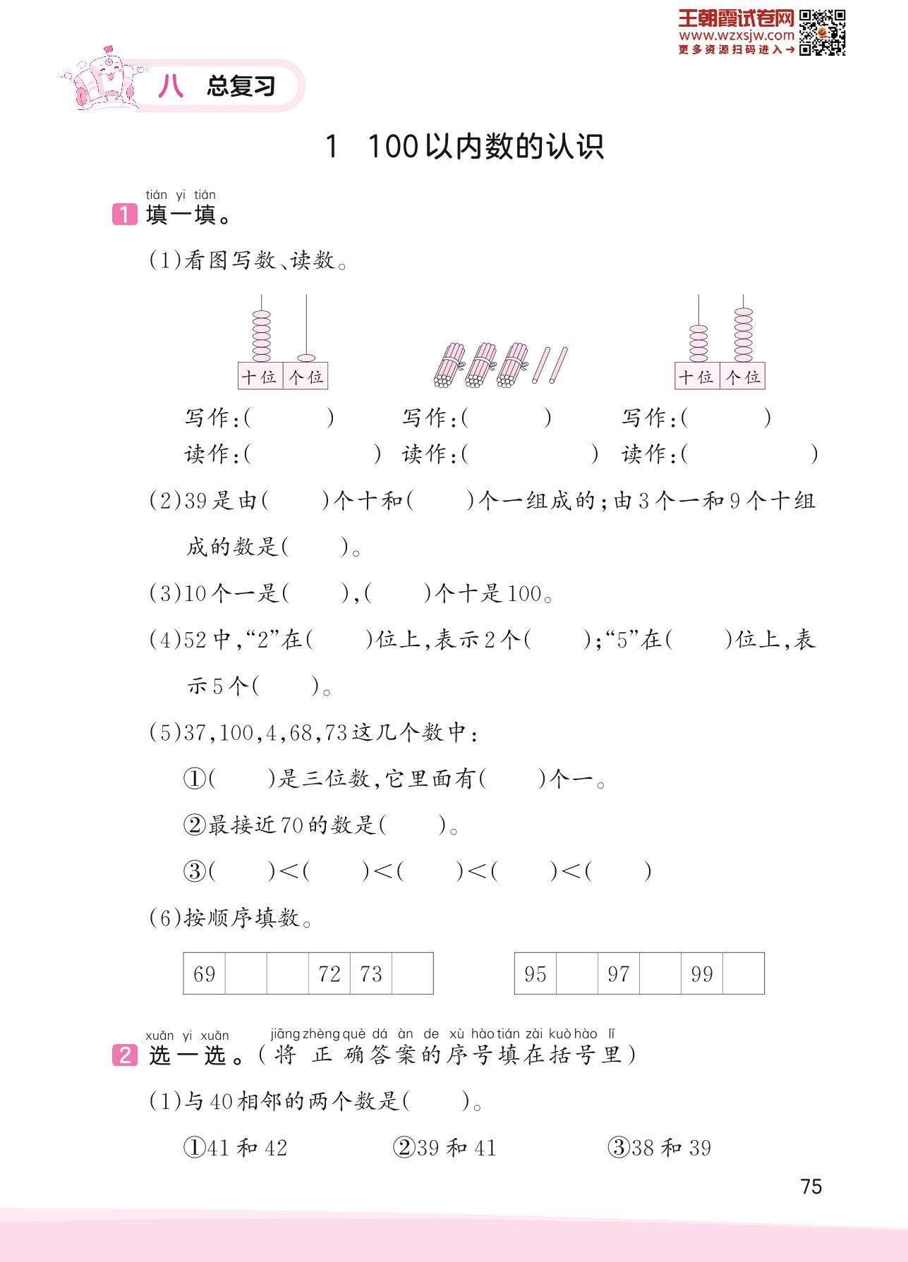2023下册一年级数学人教版 八 总复习——1 100以内数的认识