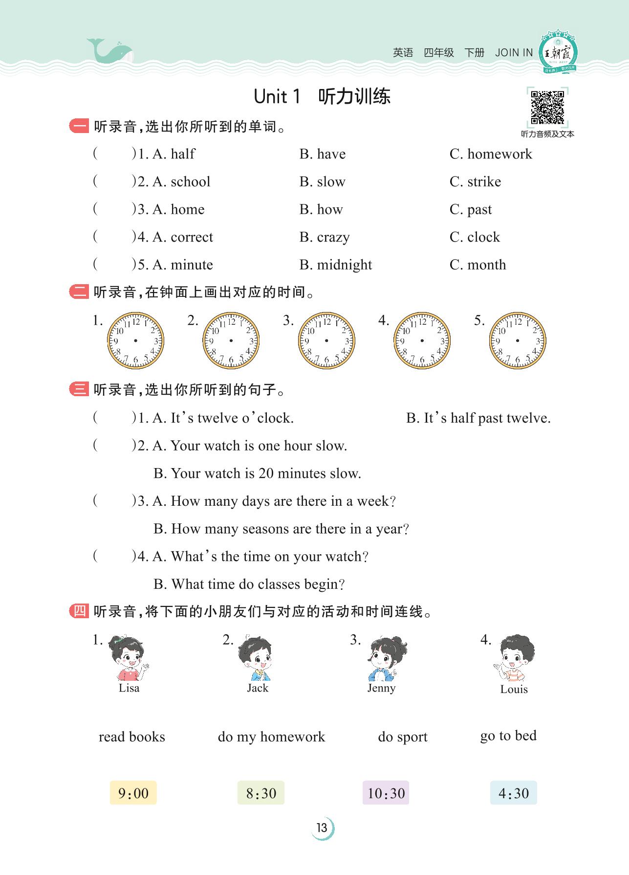 2023下册四年级英语剑桥版 Unit 1 听力训练