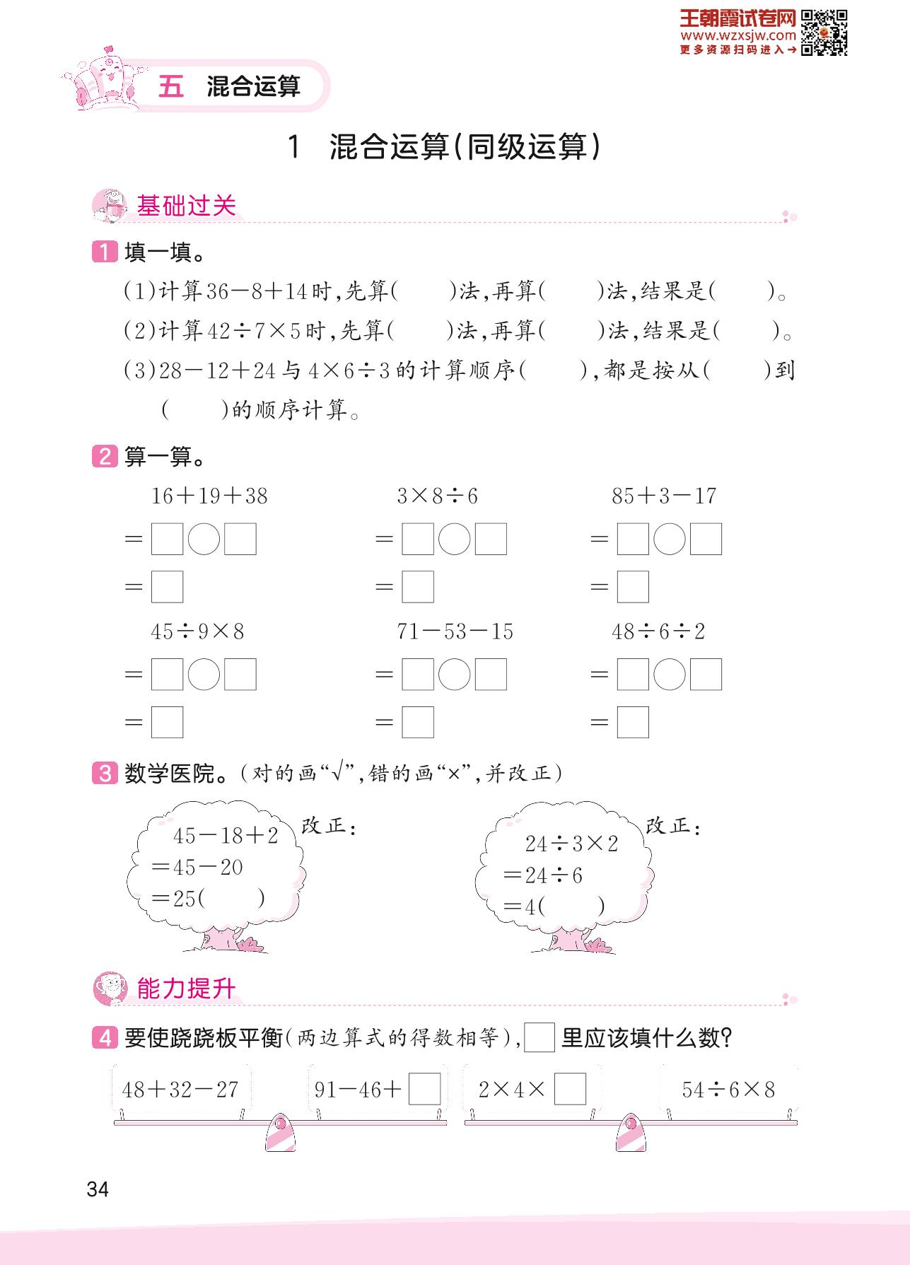 2023下册二年级数学人教版 五 混合运算——1 混合运算(同级运算)