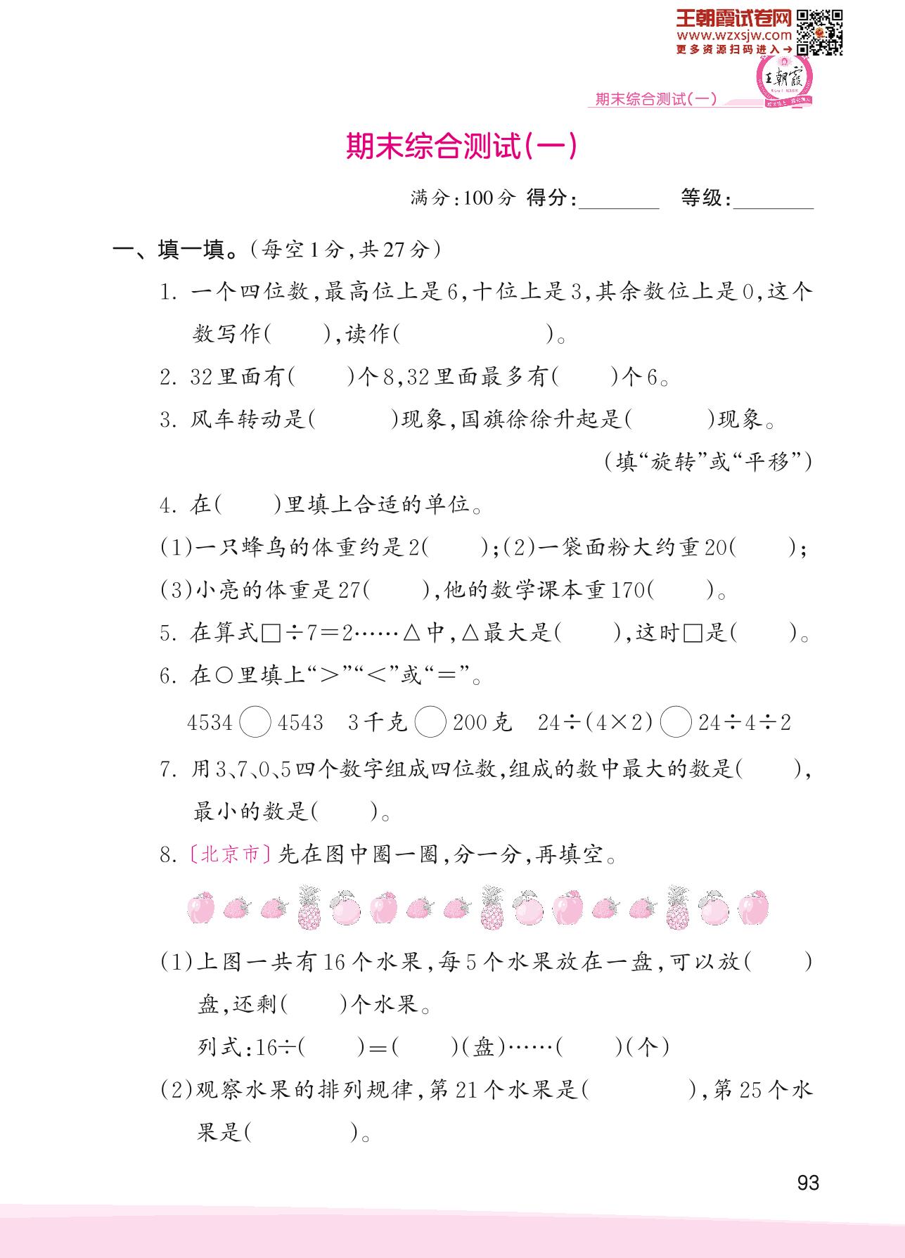 2023下册二年级数学人教版 期末综合测试(一)