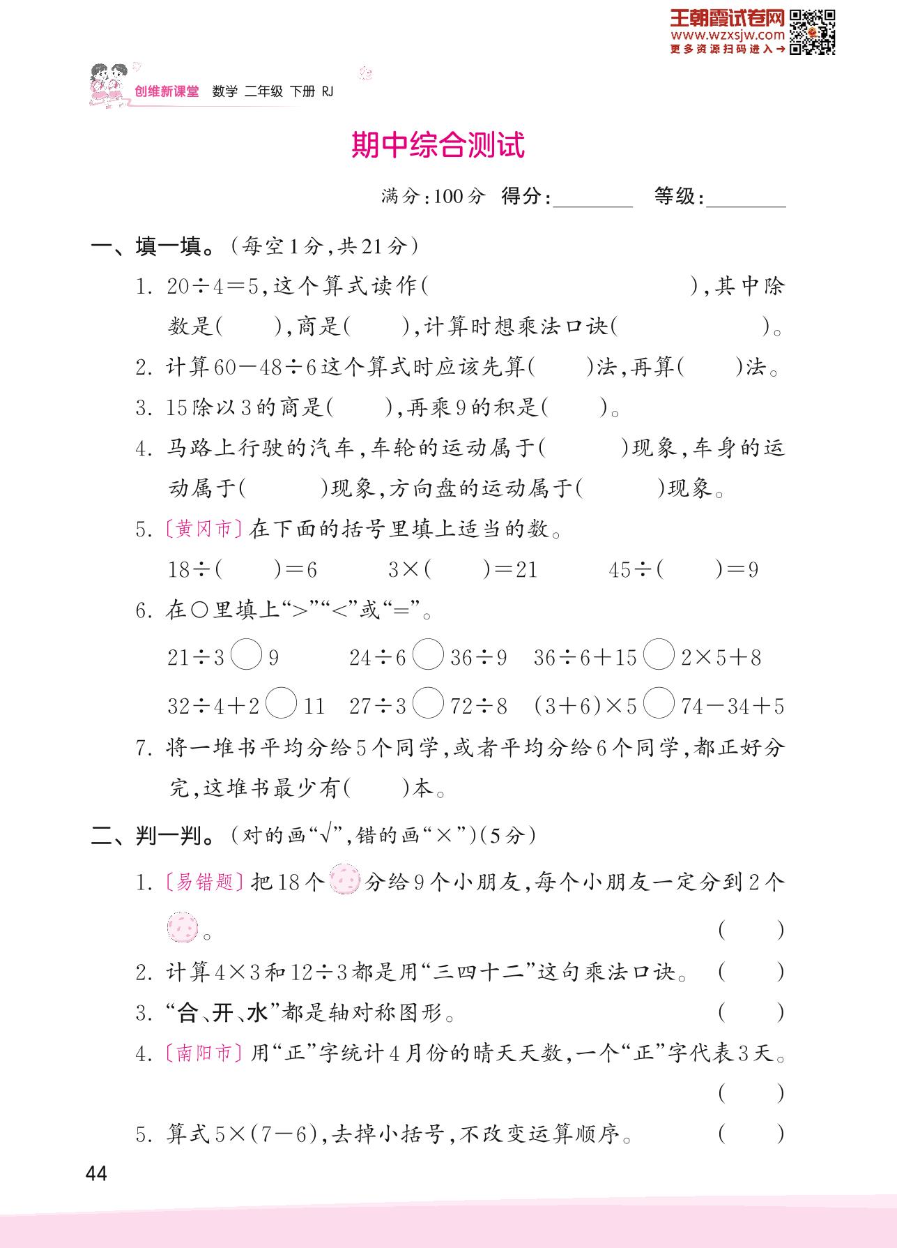 二年级数学人教版下册期中卷