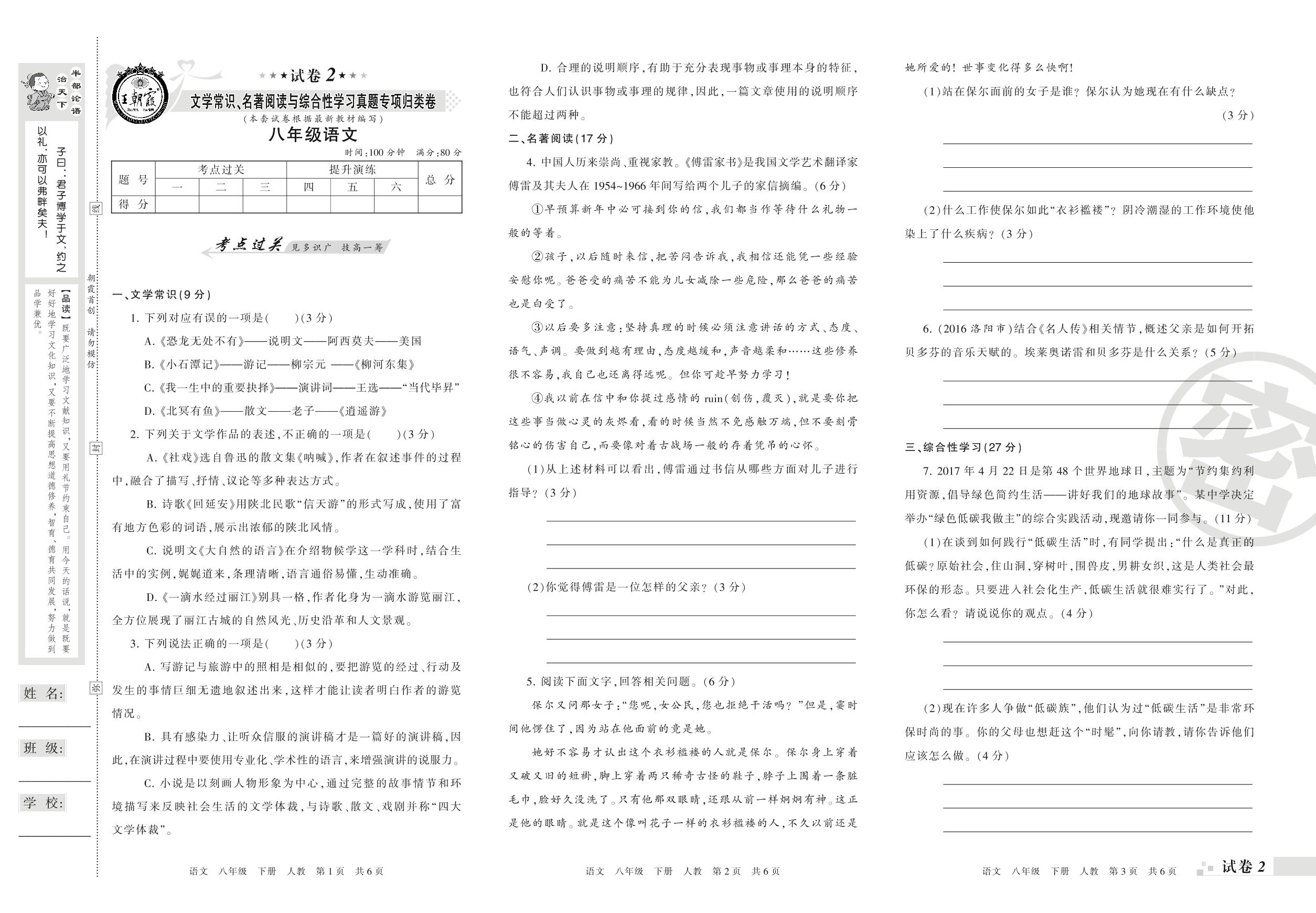 王朝霞期末专项卷——文学常识、名著阅读与综合性学习真题专项归类卷八年级下册语文(人教版)_R210802183606【2】