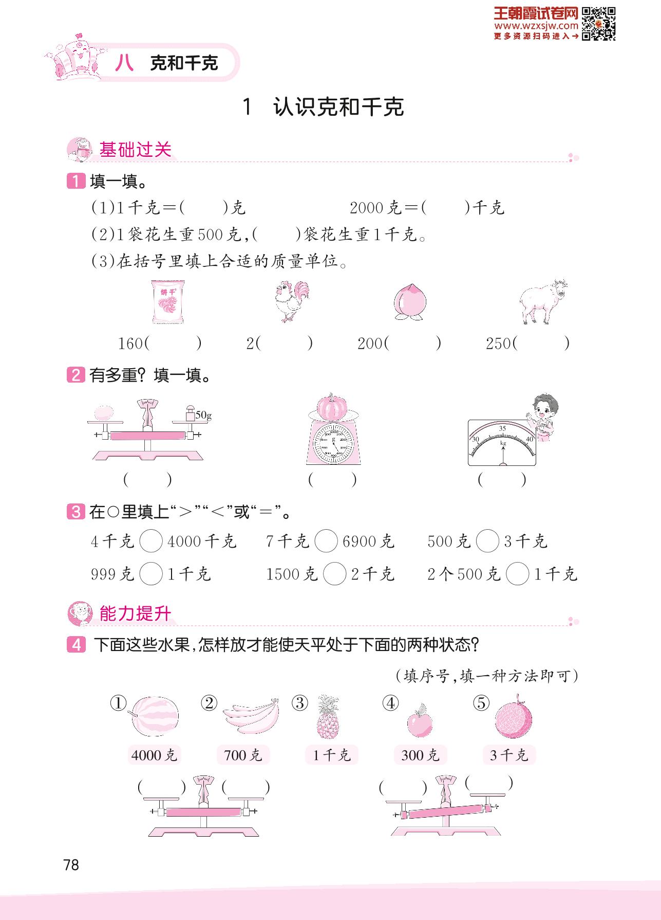 2023下册二年级数学人教版 八 克和千克——1 认识克和千克