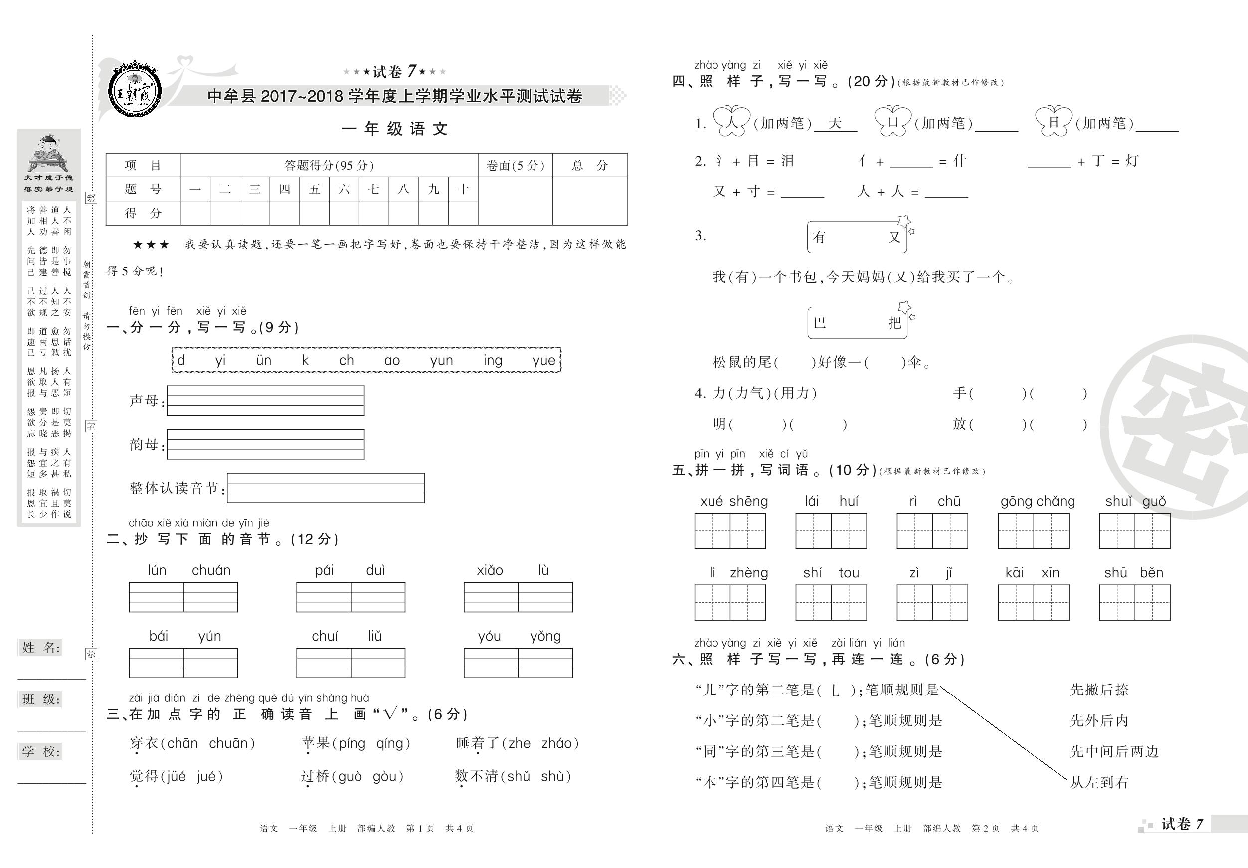 2017-2018学年第一学期郑州市中牟县一年级语文试卷(人教版)【7】
