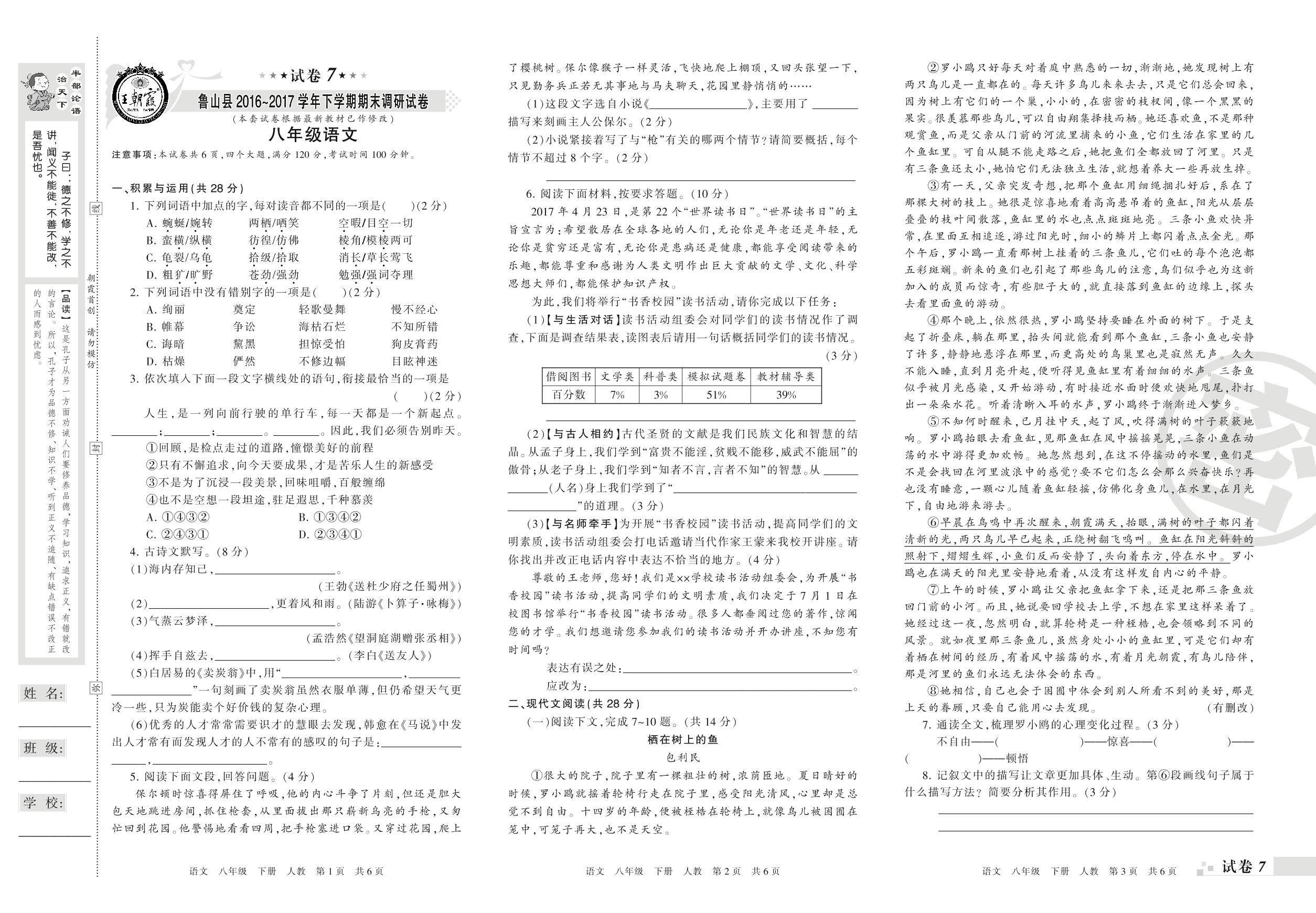 2016-2017学年第二学期平顶山市鲁山县八年级语文试卷(人教版)【7】