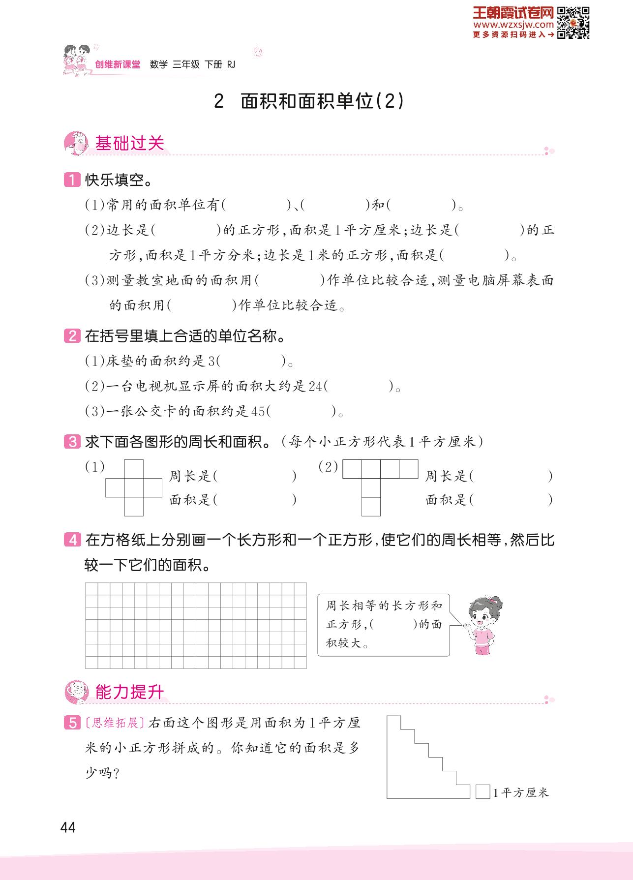 2023下册三年级数学人教版 五 面积——2 面积和面积单位(2)
