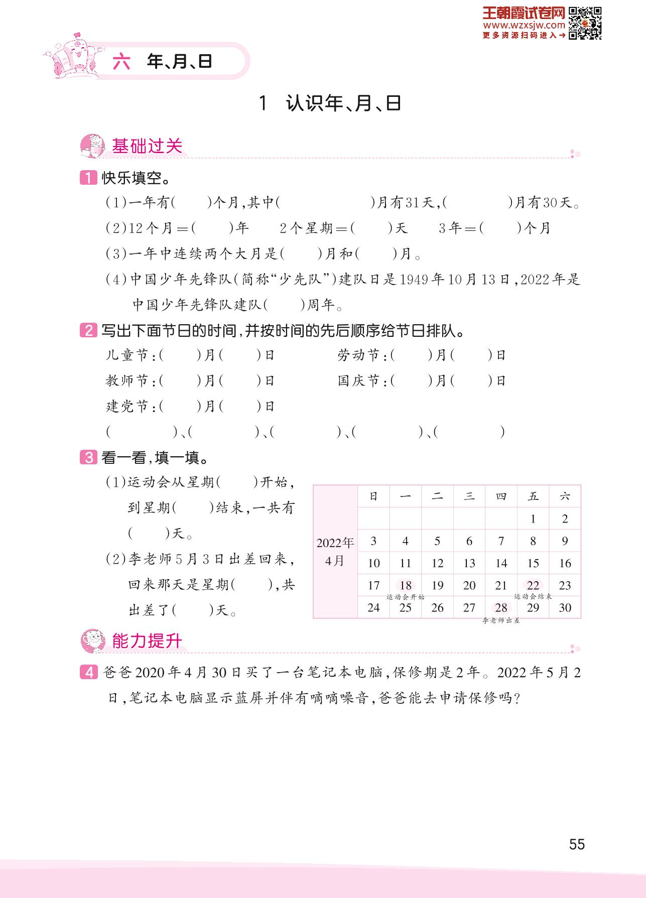 2023下册三年级数学人教版 六 年、月、日——1 认识年、月、日