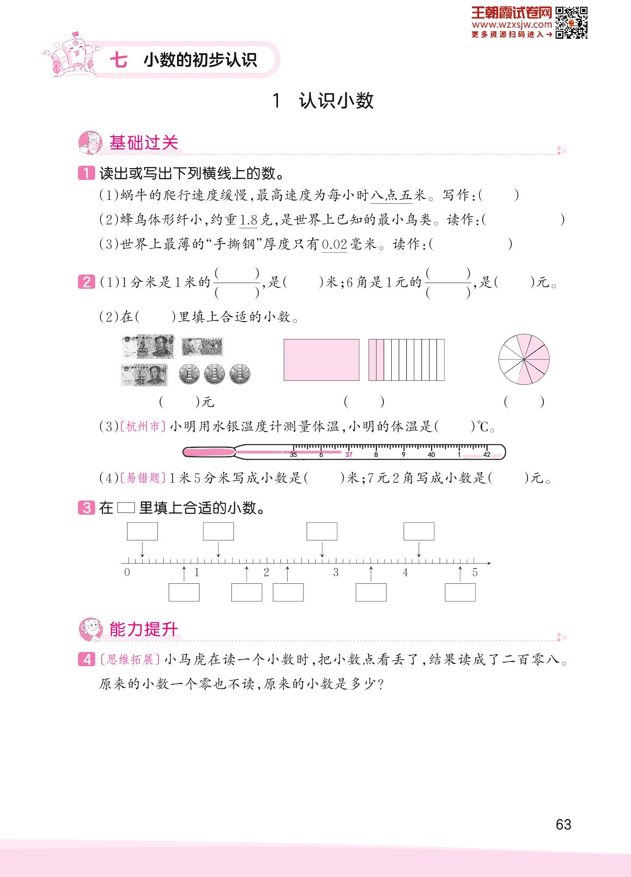 2023下册三年级数学人教版 七 小数的初步认识——1 认识小数