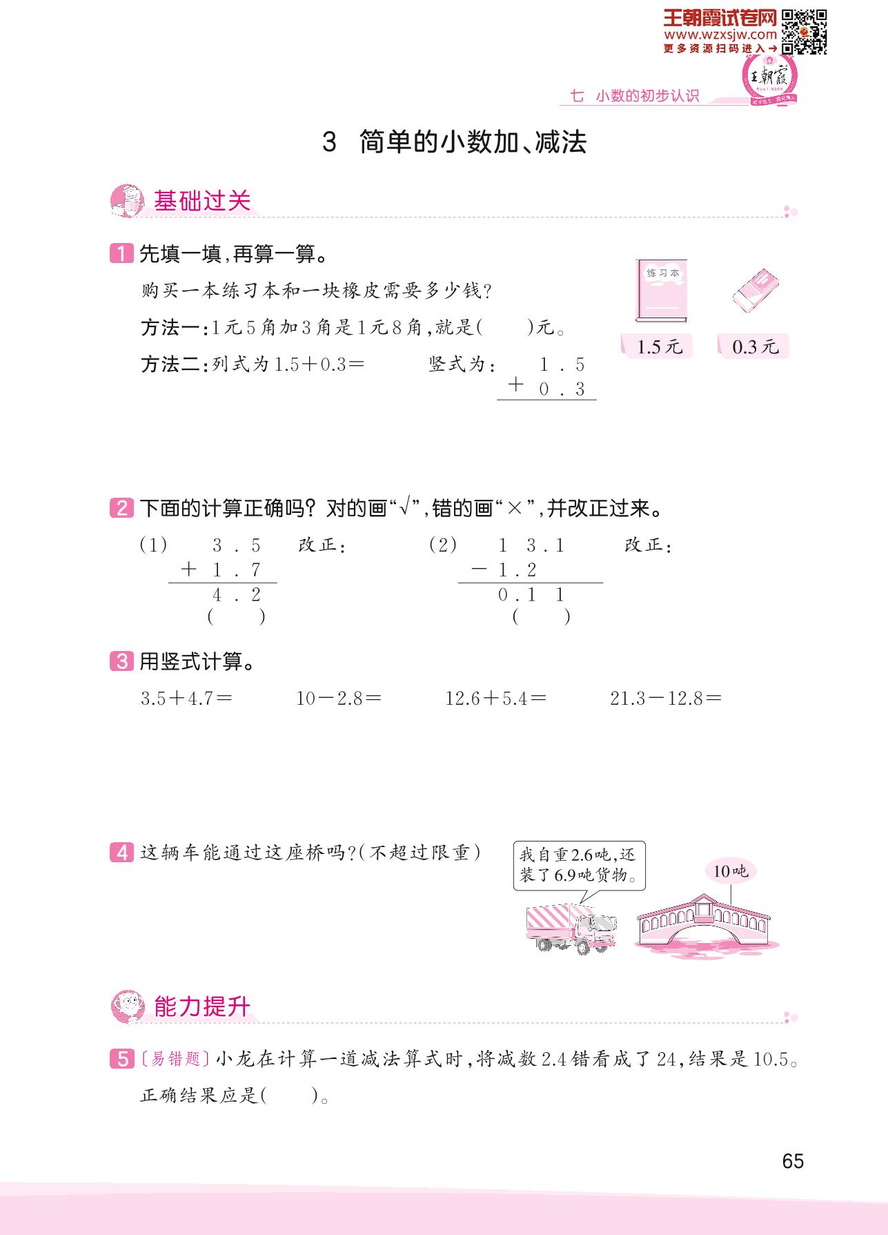 2023下册三年级数学人教版 七 小数的初步认识——3 简单的小数加、减法