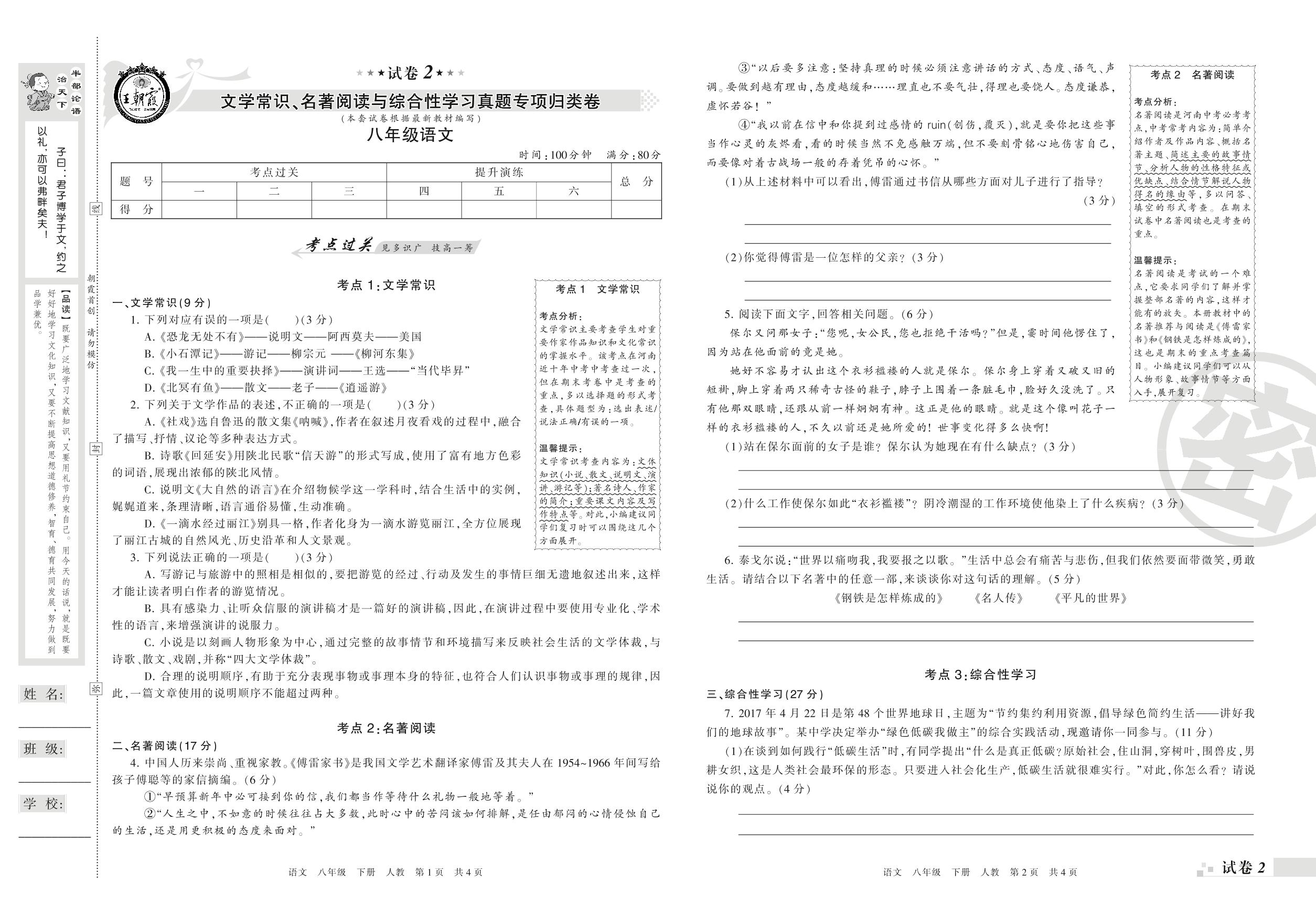 王朝霞期末专项卷——文学常识、名著阅读与综合性学习真题专项归类卷八年级下册语文(人教版)_R210802184107【2】