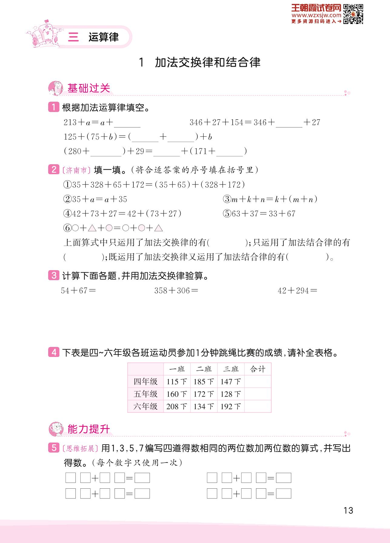 2023下册四年级数学人教版 三 运算律——1 加法交换律和结合律