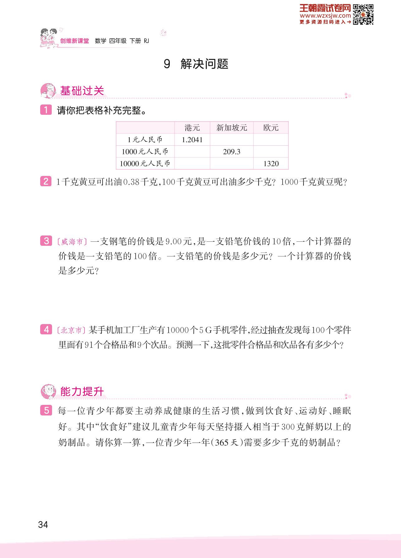 2023下册四年级数学人教版 四 小数的意义和性质——练习课(第7~8课时)