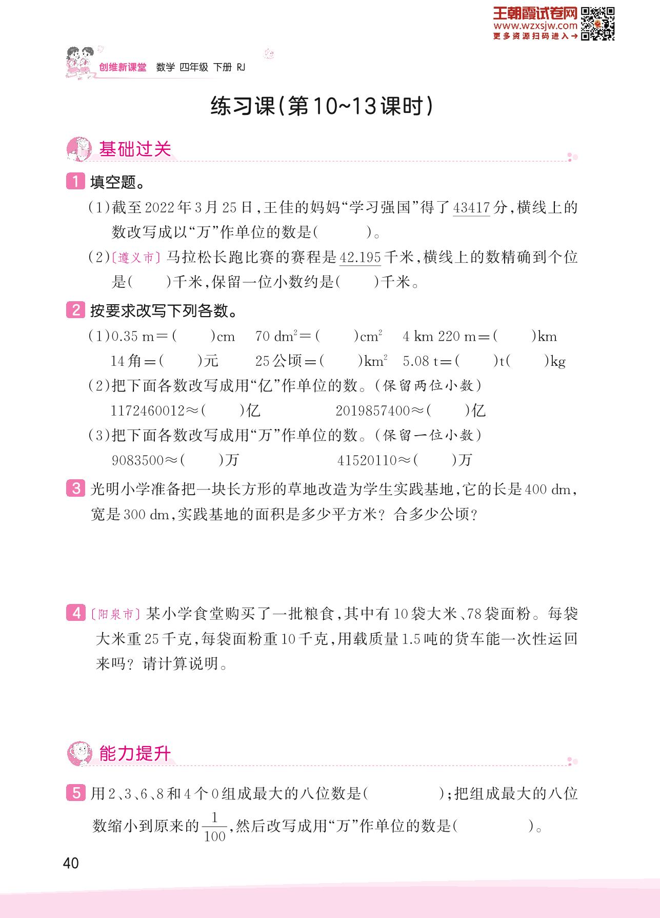 2023下册四年级数学人教版 四 小数的意义和性质——练习课(第11~12课时)
